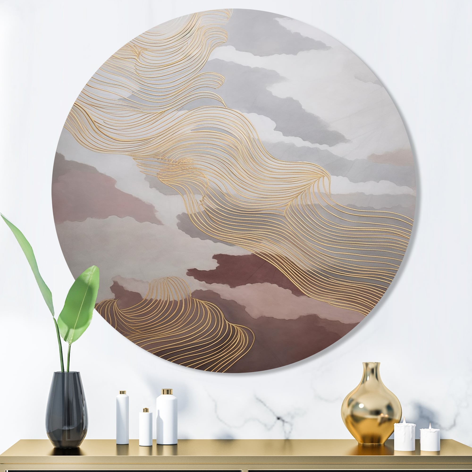 Designart "Gold And Grey Linear Expressions IV" Minimalism Line Art Metal Round Wall Art