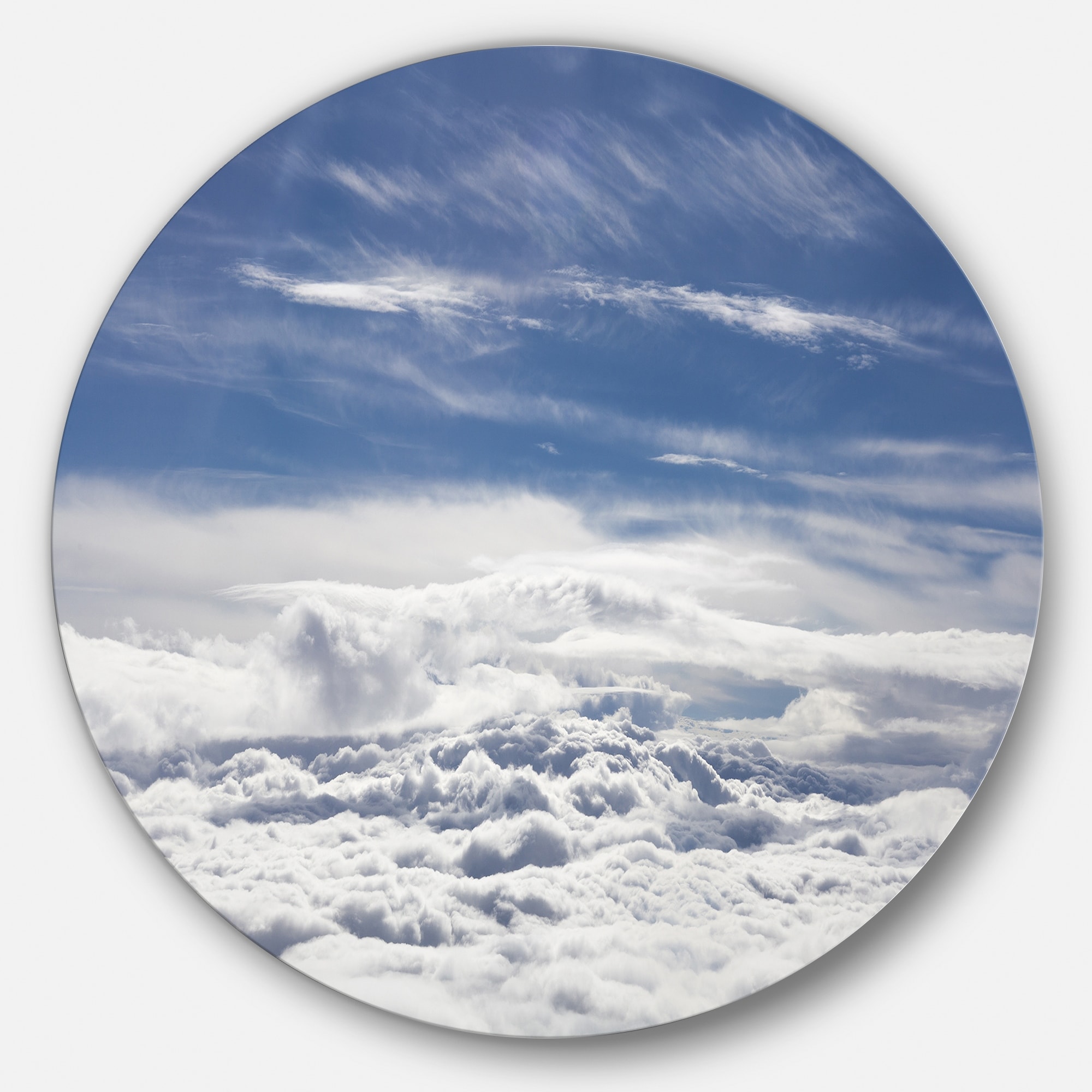 Designart 'Flight over Bright Clouds' Contemporary Landscape Large Disc Metal Wall art