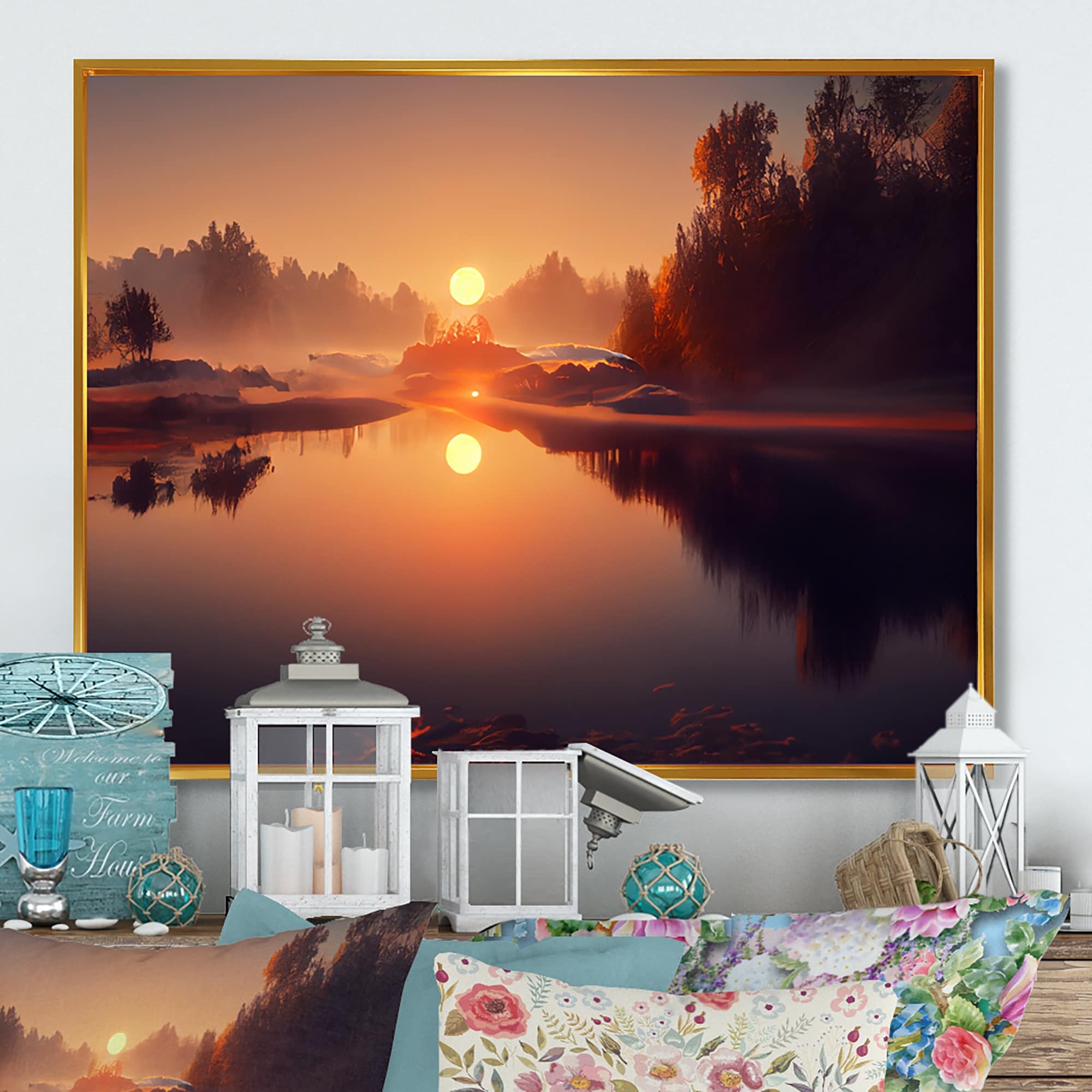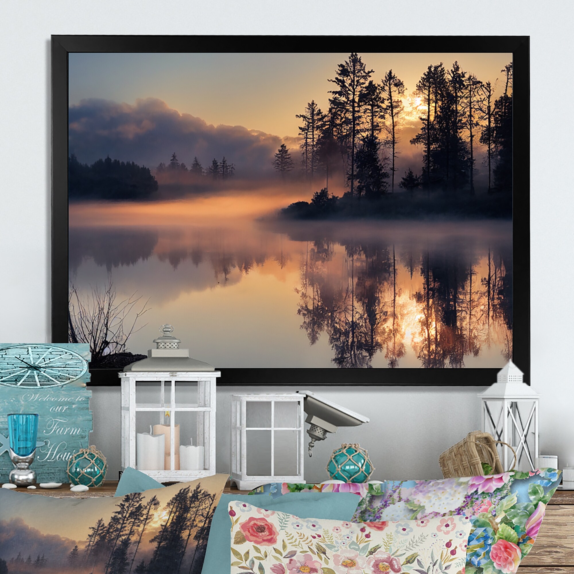 Designart "Morning Fog Over the Lake Sunset I" Landscape Lake Framed Art Print