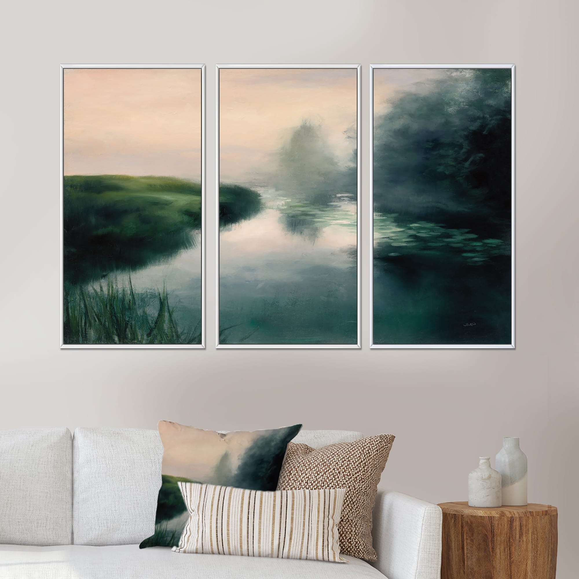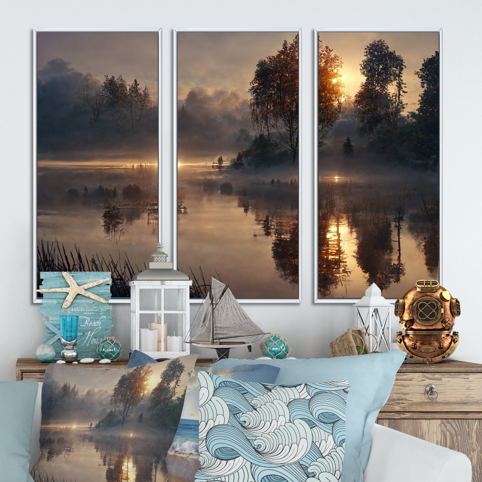 Designart "Morning Fog Over the Lake Sunset V" Landscape Lake Framed Canvas Wall Art Print - 3 Panels