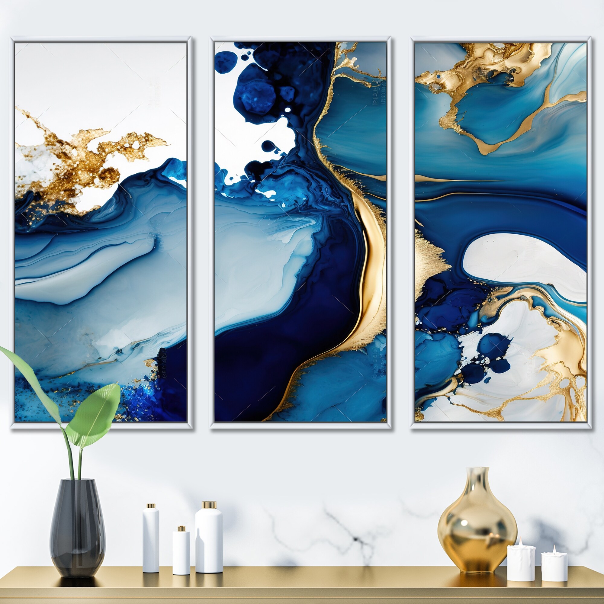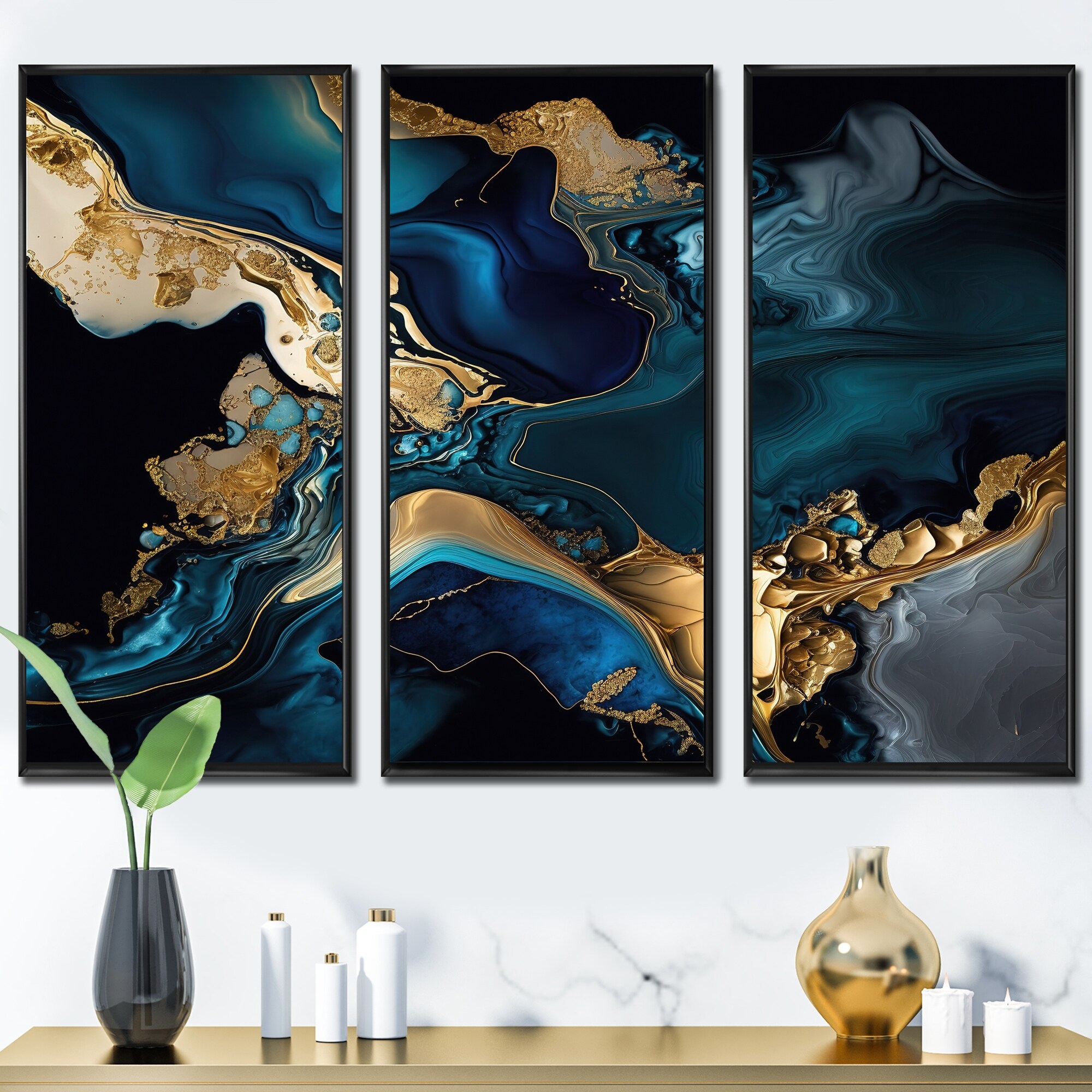 Designart "Abstract Geode Marble Blue I" Abstract Marble Framed Canvas Art Print - 3 Panels