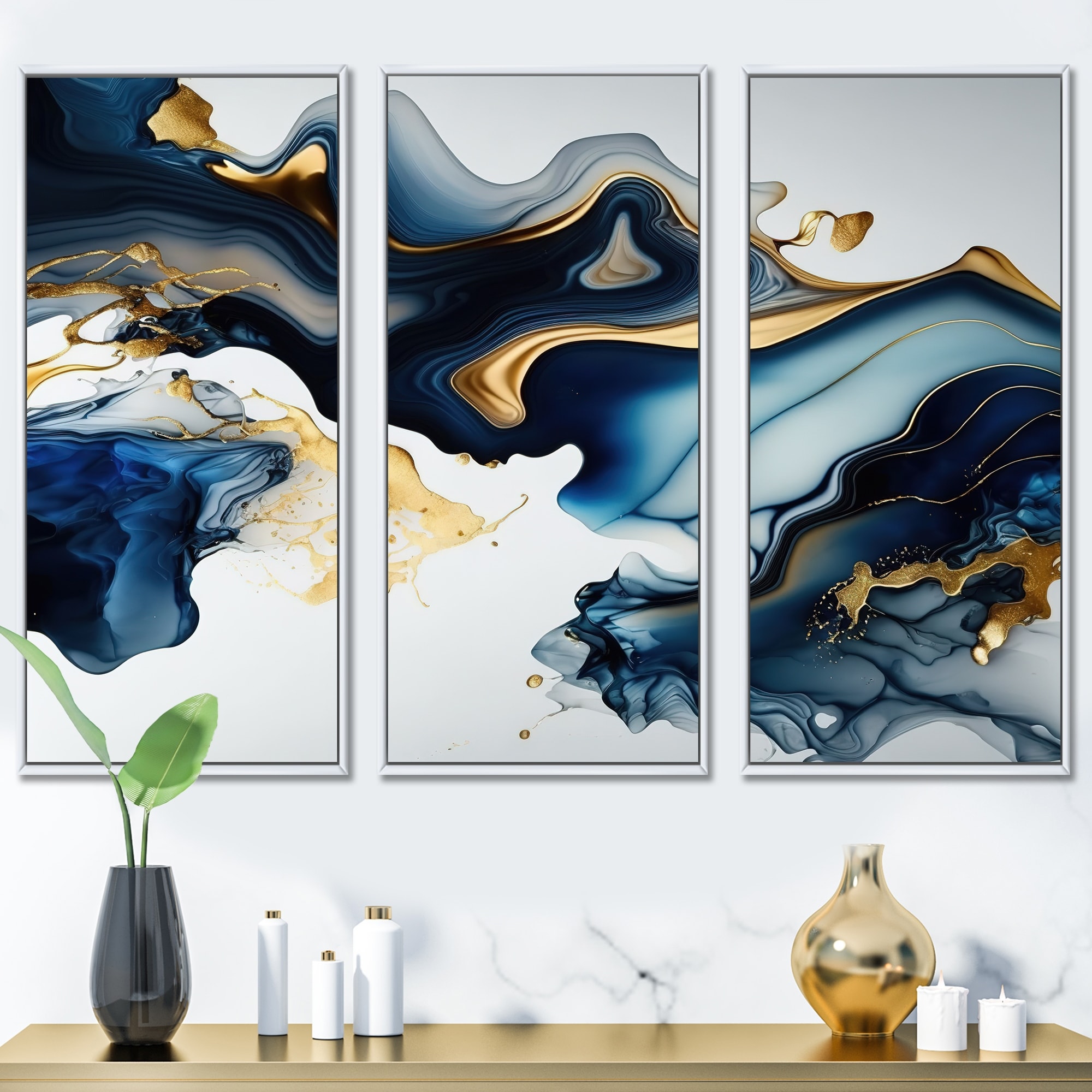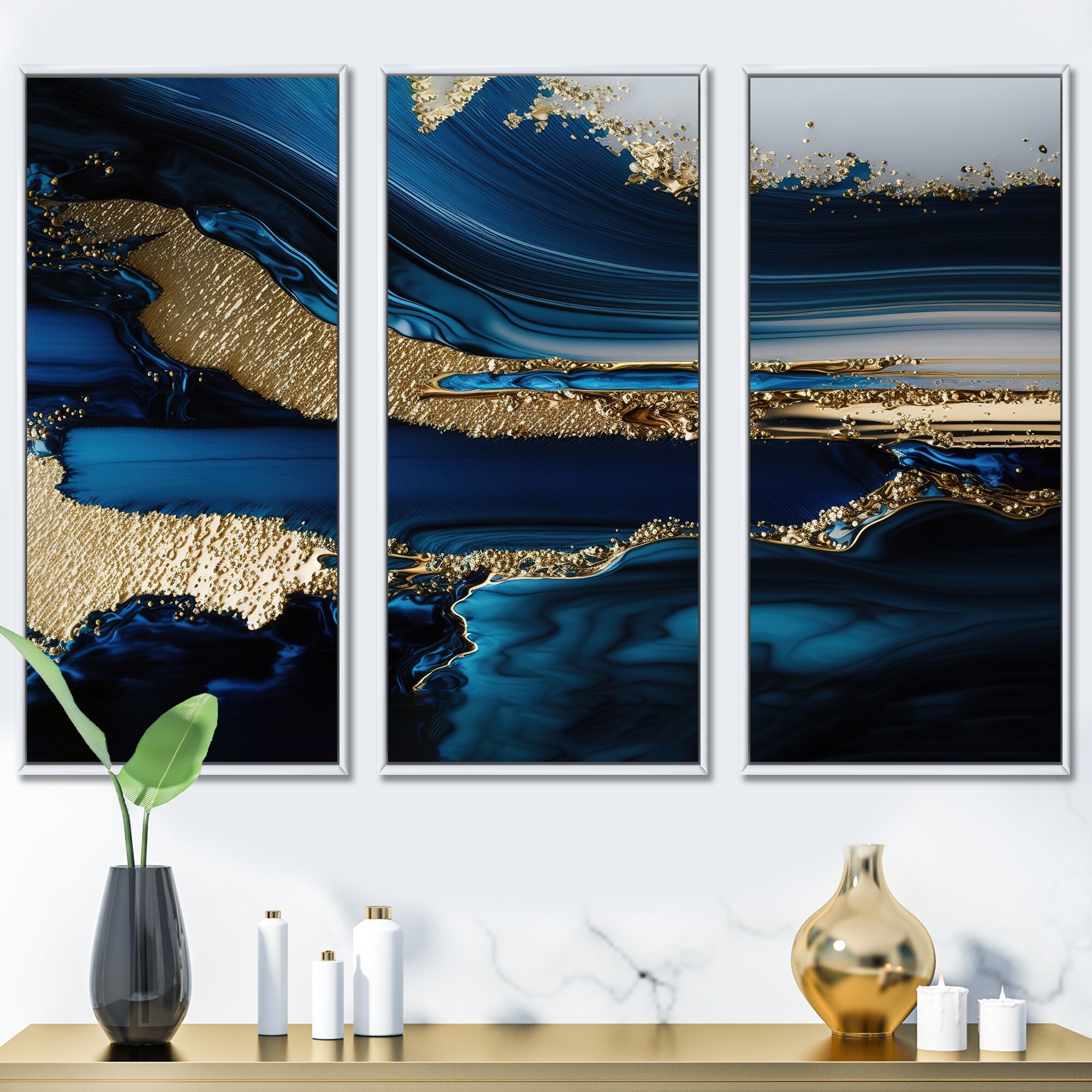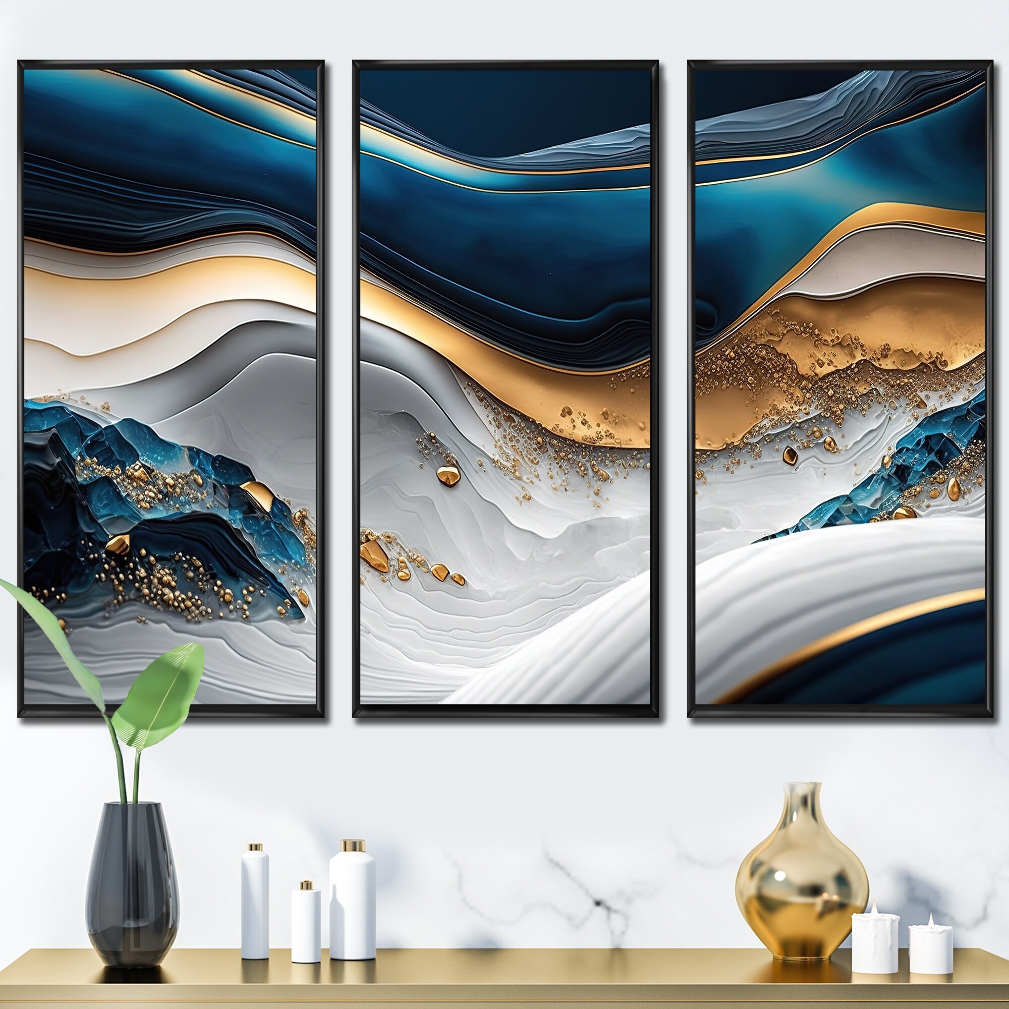 Designart "Abstract Geode Waves Blue V" Modern Waves Framed Canvas Art Print - 3 Panels