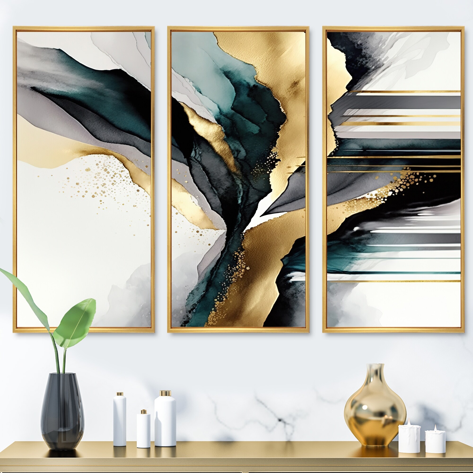 Designart "Abstract Geode Waves Gold II" Modern Waves Framed Canvas Art Print - 3 Panels