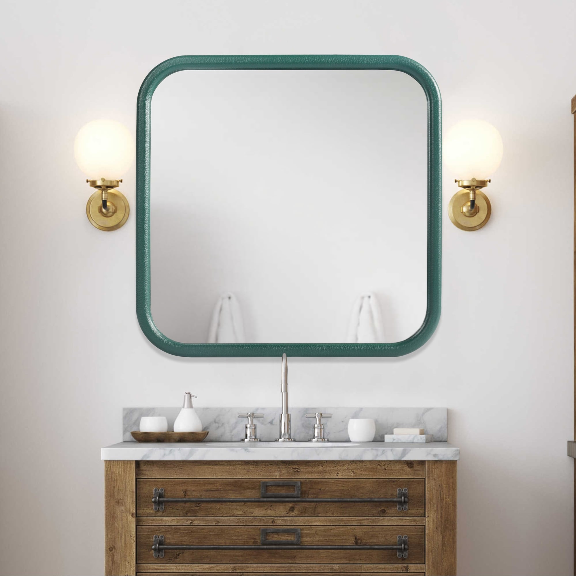 Square Champagne Woven Grain Decorative Wall Hanging Mirror,PU Covered MDF Framed Mirror for Bedroom Living Room Vanity Entryway