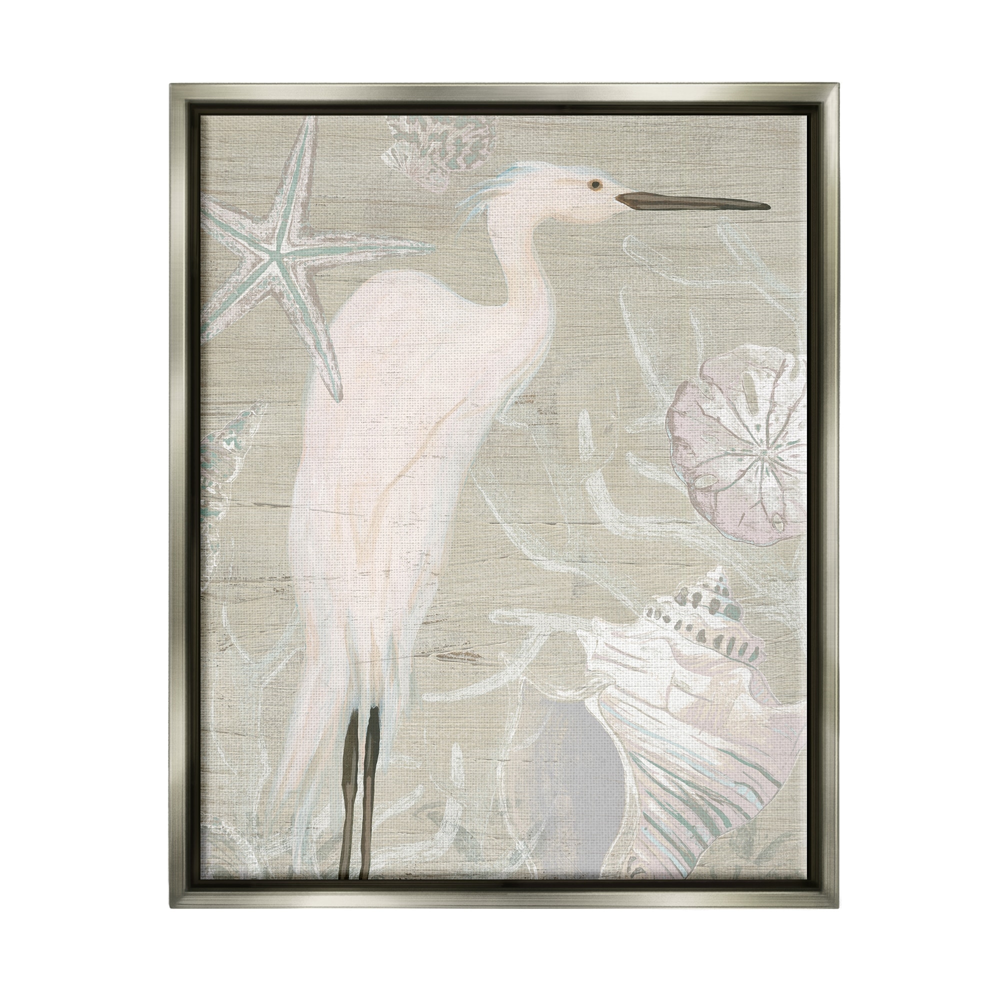 Stupell Industries White Egret Seashells Starfish Rustic Grain Pattern Floater Frame, Design by June Erica Vess