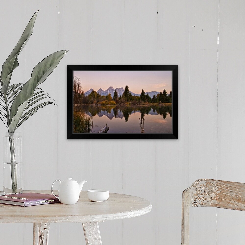 "Reflection of pine trees in lake at sunrise, Grand Teton National Park." Black Framed Print