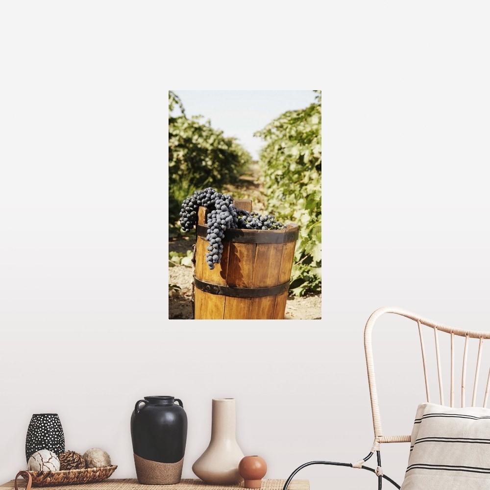 "Red grapes in antique basket in vineyard" Poster Print - Multi