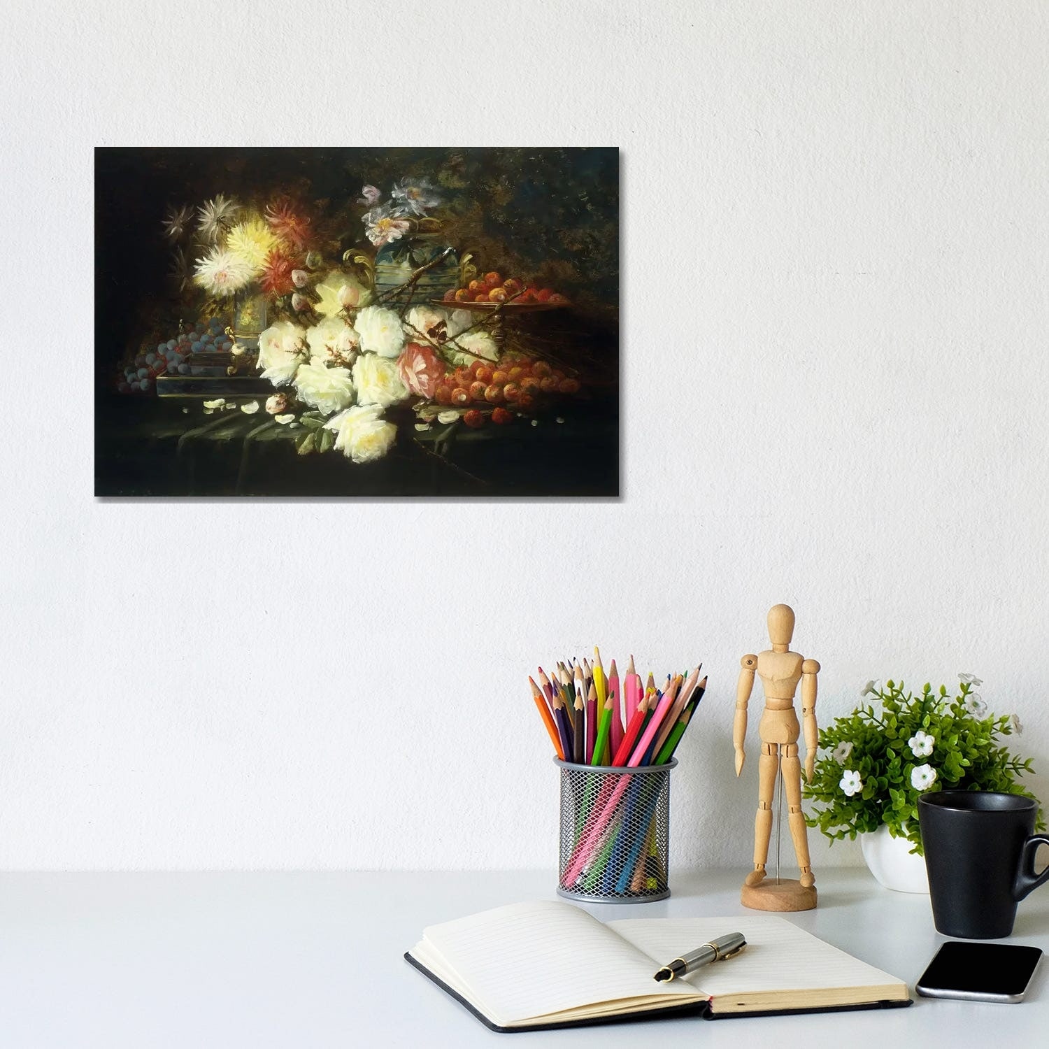 iCanvas "Still life with roses, chrysanthemums, grapes and strawberries" by Modeste Carlier Canvas Print