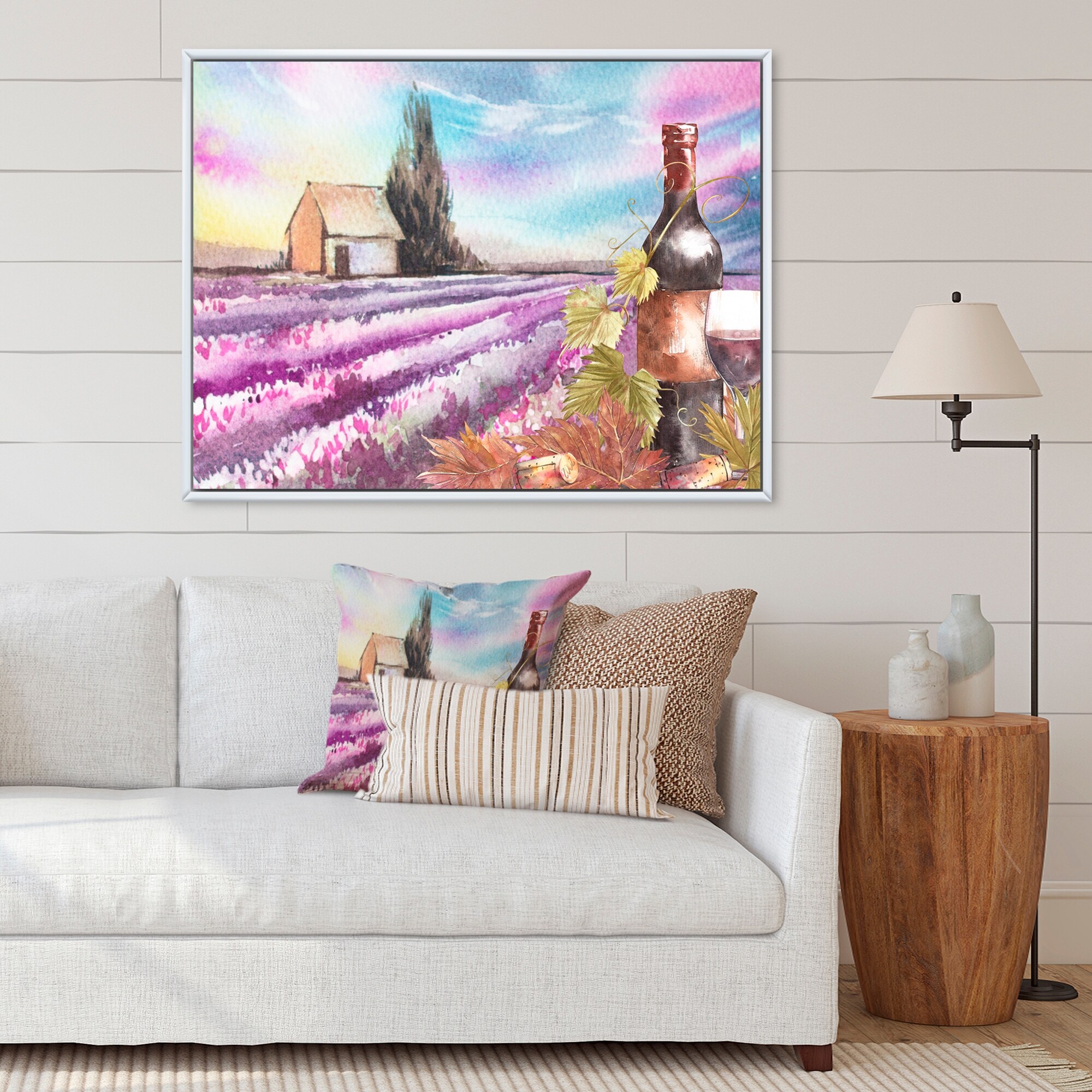 Designart "Bottles And Leaves of Grapes, A Lavender Field III" Country Framed Canvas Wall Art Print