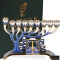 Matashi Hand Painted Blue Enamel Menorah Candelabra with a Jerusalem City Design