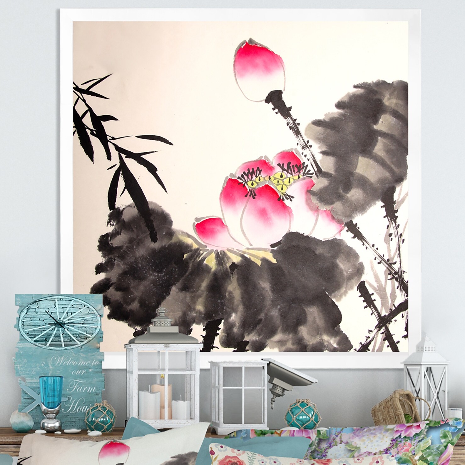 Designart "Ink Lotus Painting Hand Drawn" Traditional Framed Art Print