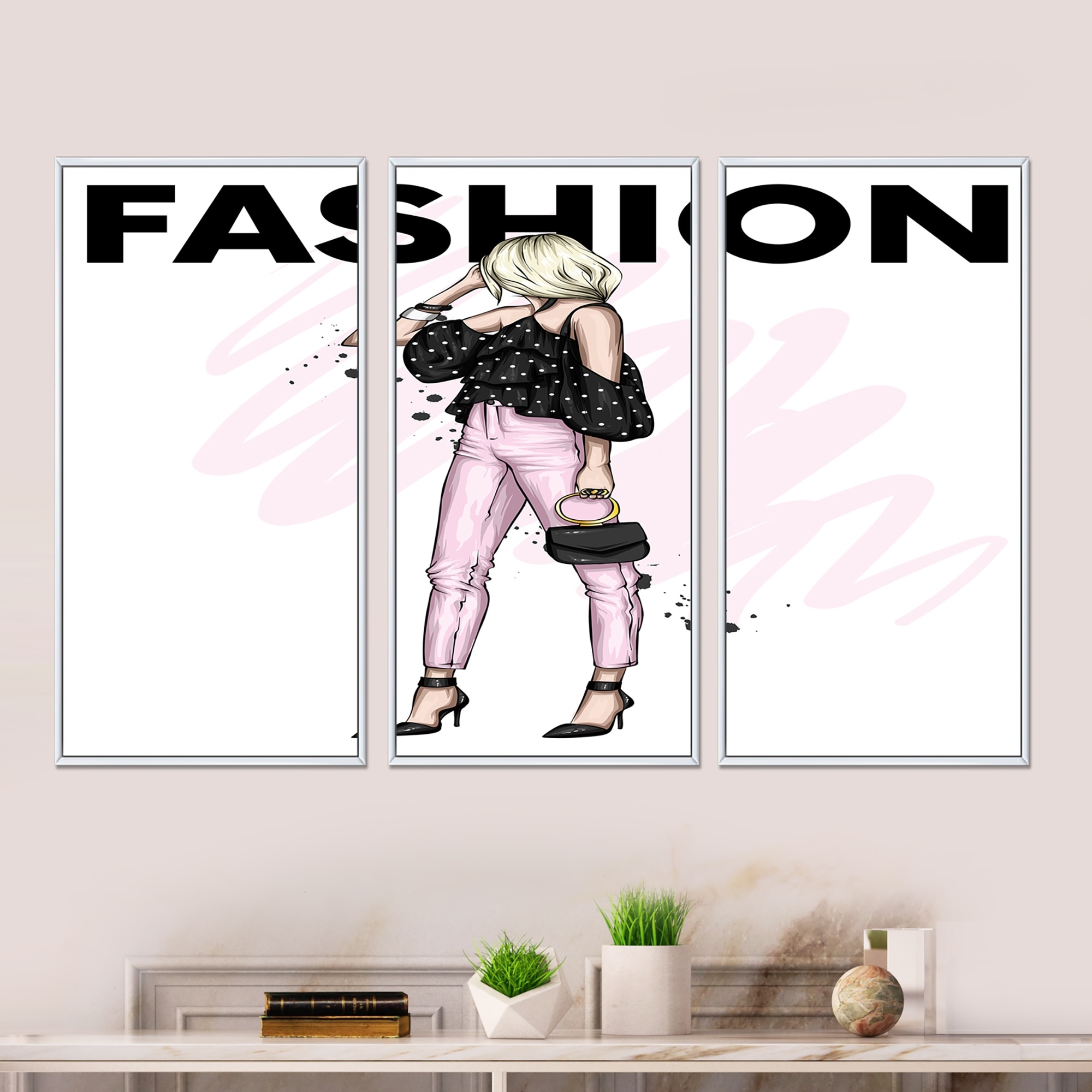 Designart "Young Woman in Pink With Little Black Handbag" Shabby Chic Framed Canvas Wall Art Print Set of 3 - 4 Colors of Frames