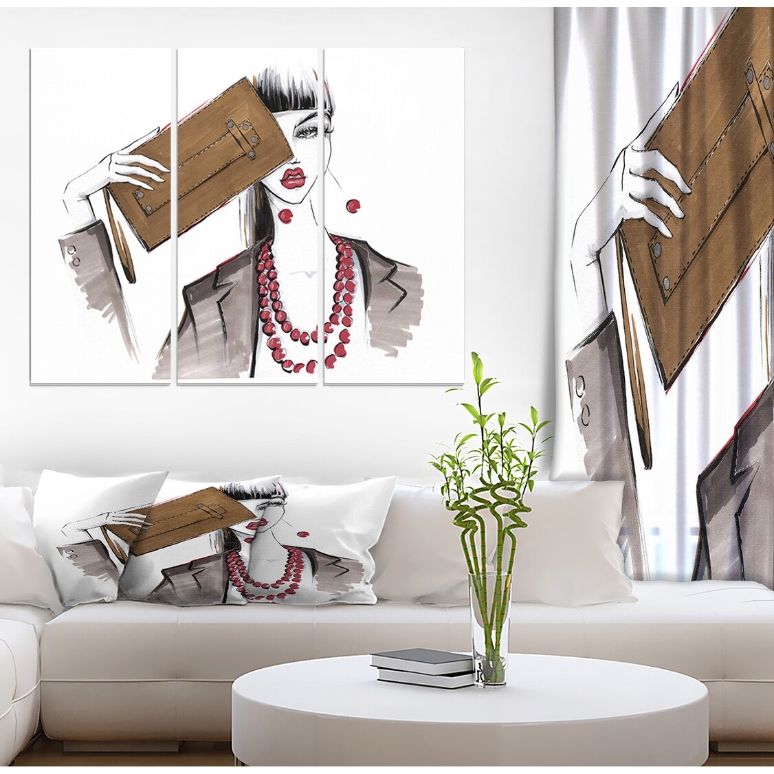 Designart "Fashionable Girl with Handbag" Glamour Print on Wrapped Canvas set - 36x28 - 3 Panels