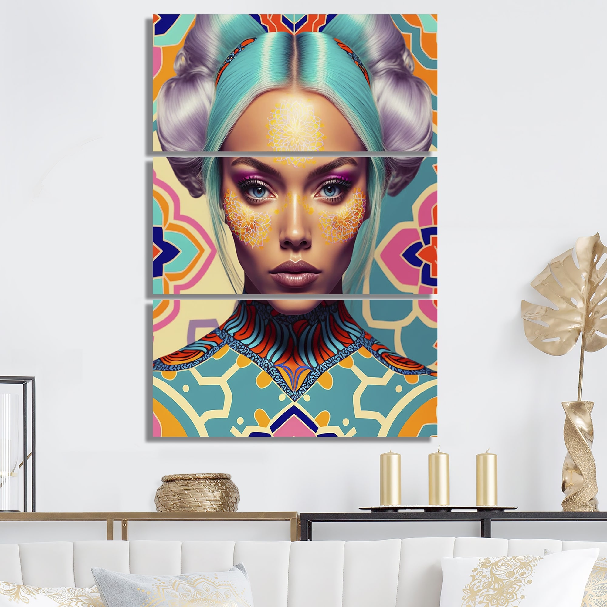 Designart "Retrofuturistic Contemporary Hipsters VI" Woman Pop Art Canvas Art Print - 3 Panels