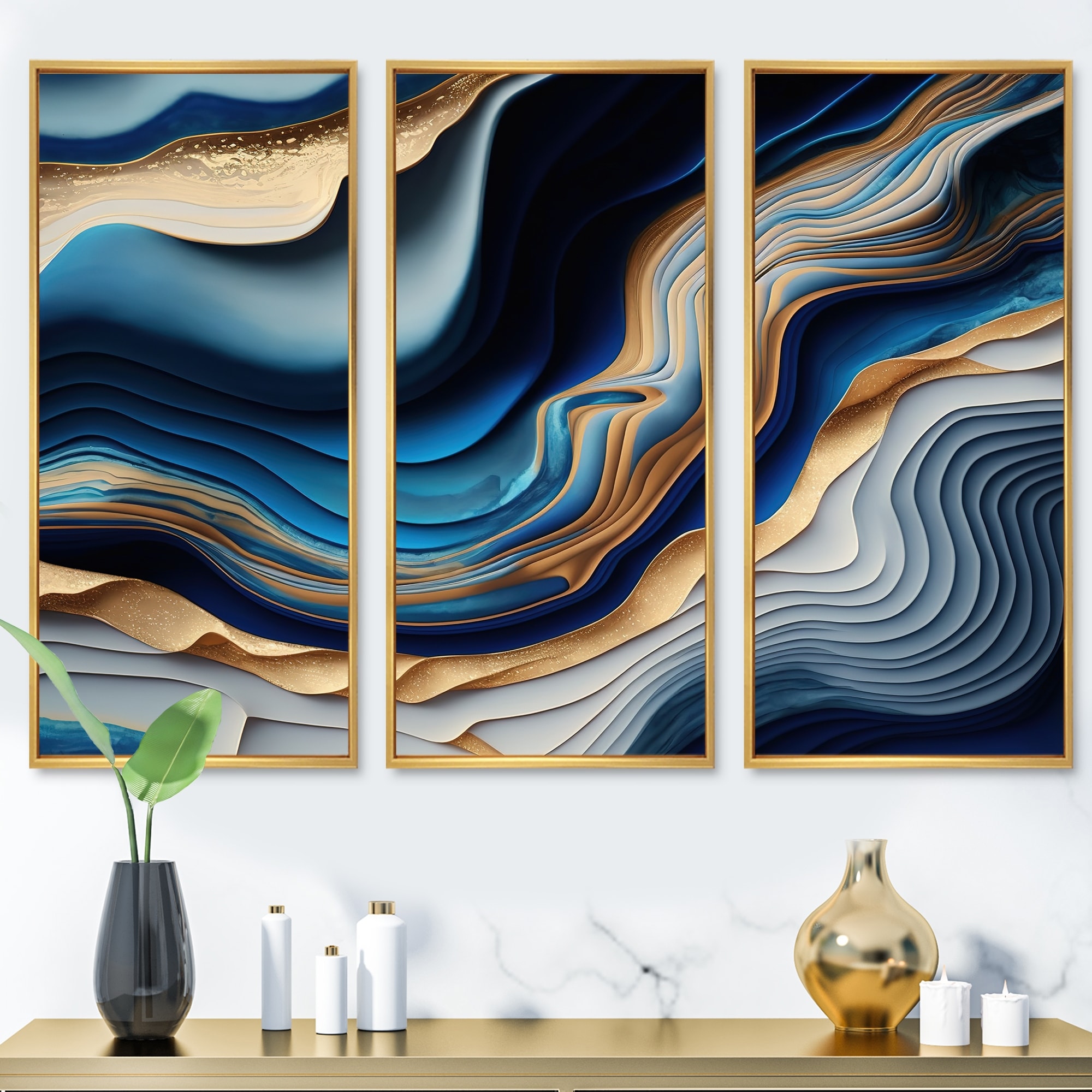 Designart "Vibrant Blue And Gold Flow Art II" Transitional Framed Canvas Art Print - 3 Panels
