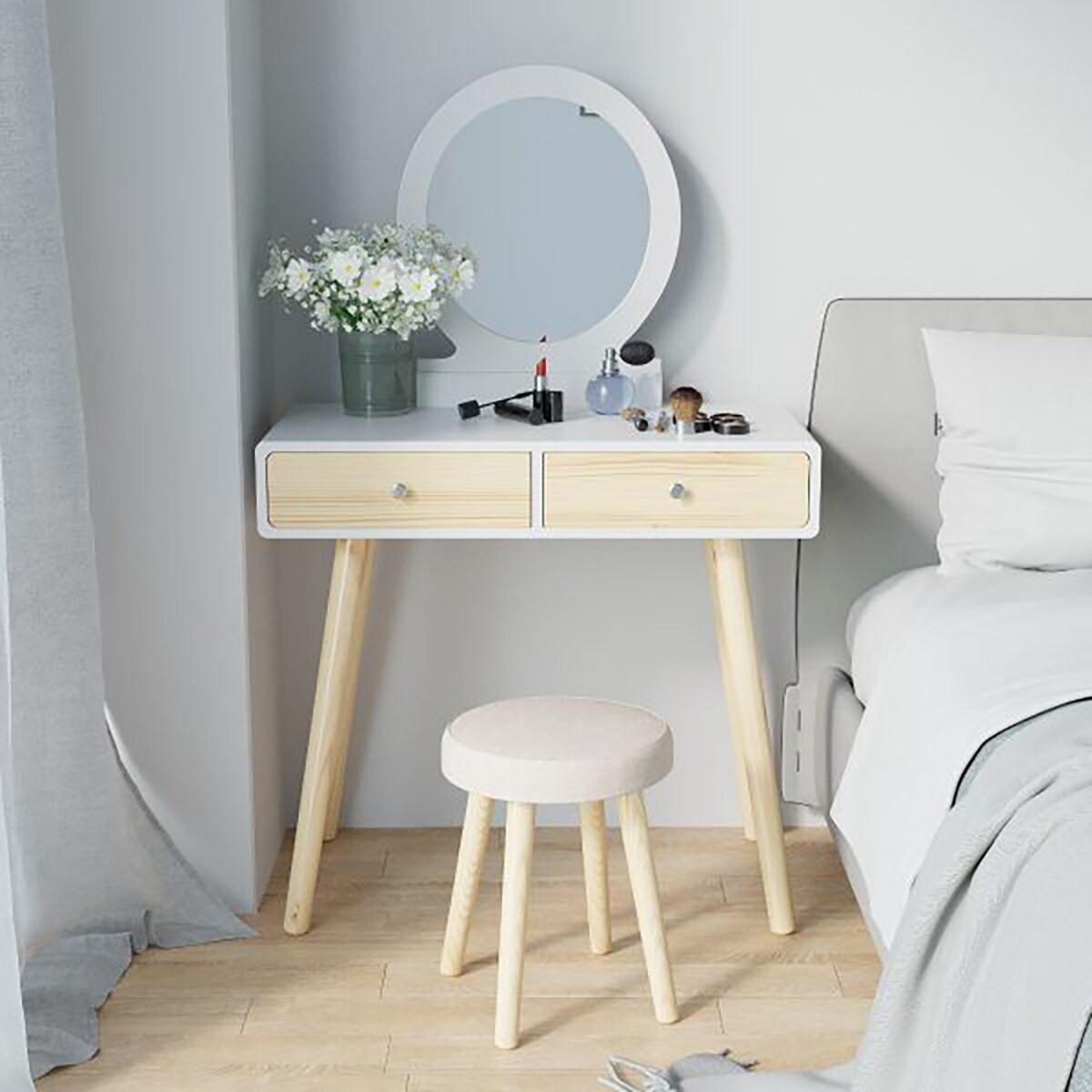White Versatile Vanity Set with Mirror,Drawers and Stool