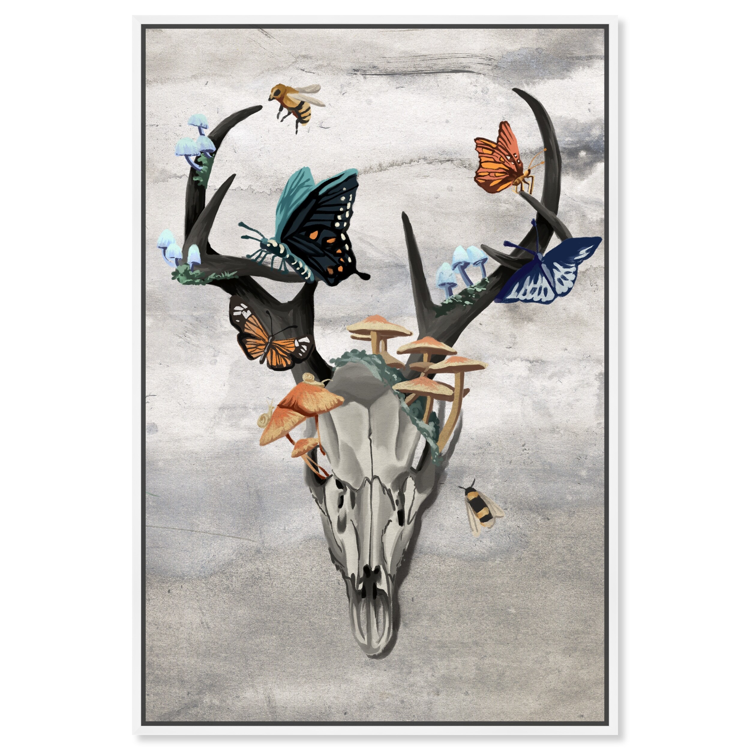 "Wings over Gray", Modern horns and wings mushroom garden Cabin / Lodge Gray Framed Canvas Wall Art Print for Living Room