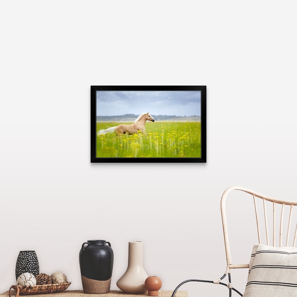 "Horse running in field." Black Framed Print