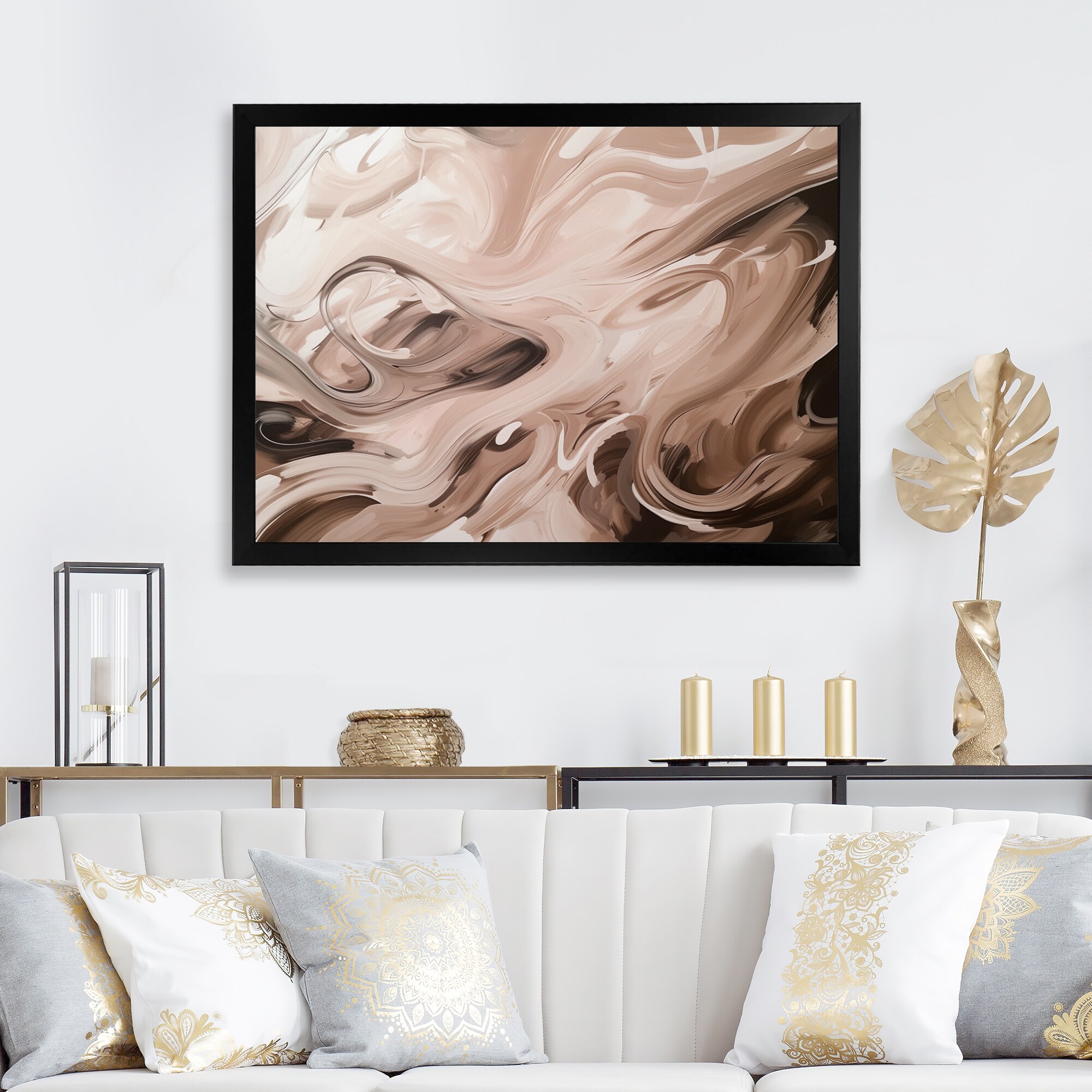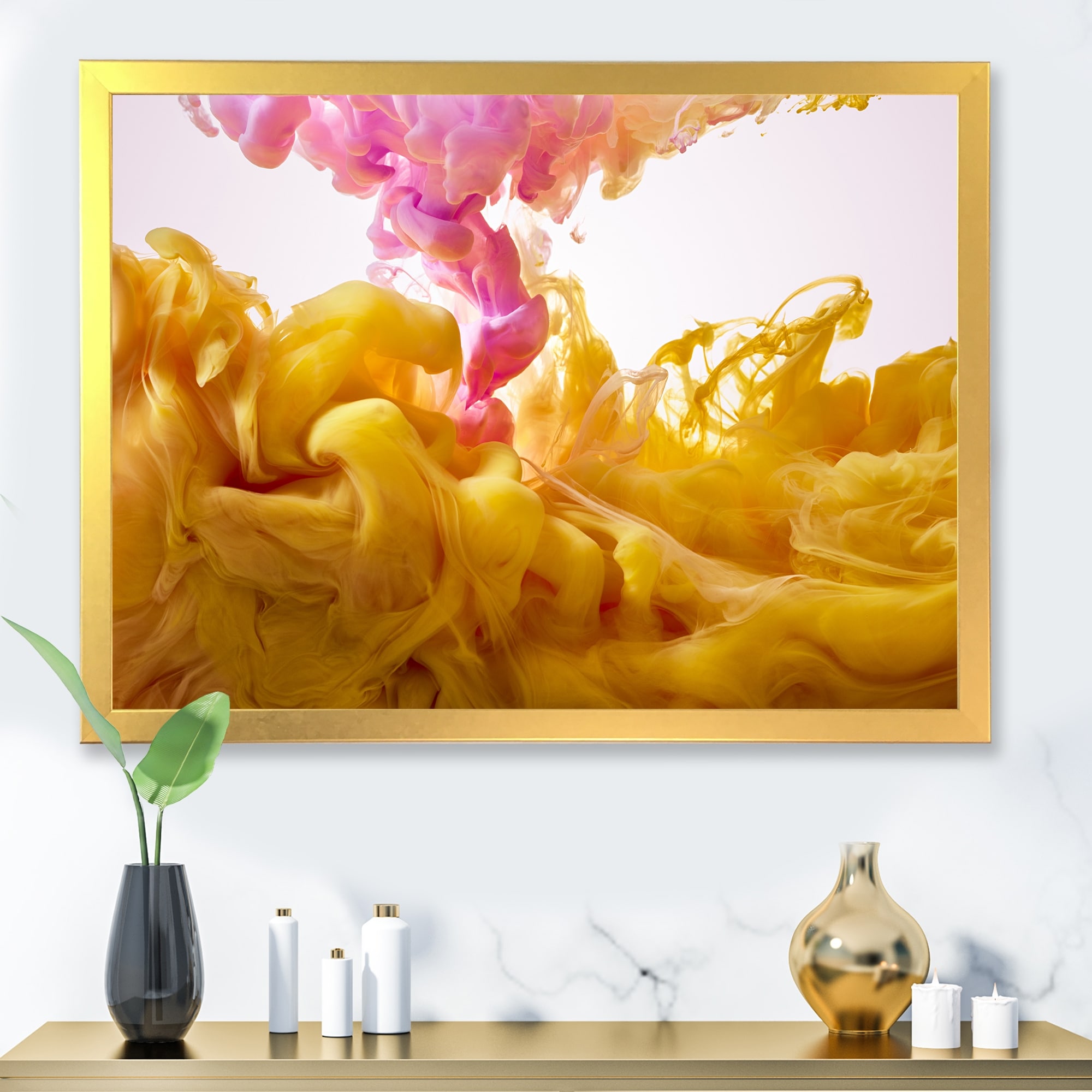 Designart "Yellow And Pink Dancing Ink Clouds" Modern Framed Art Print