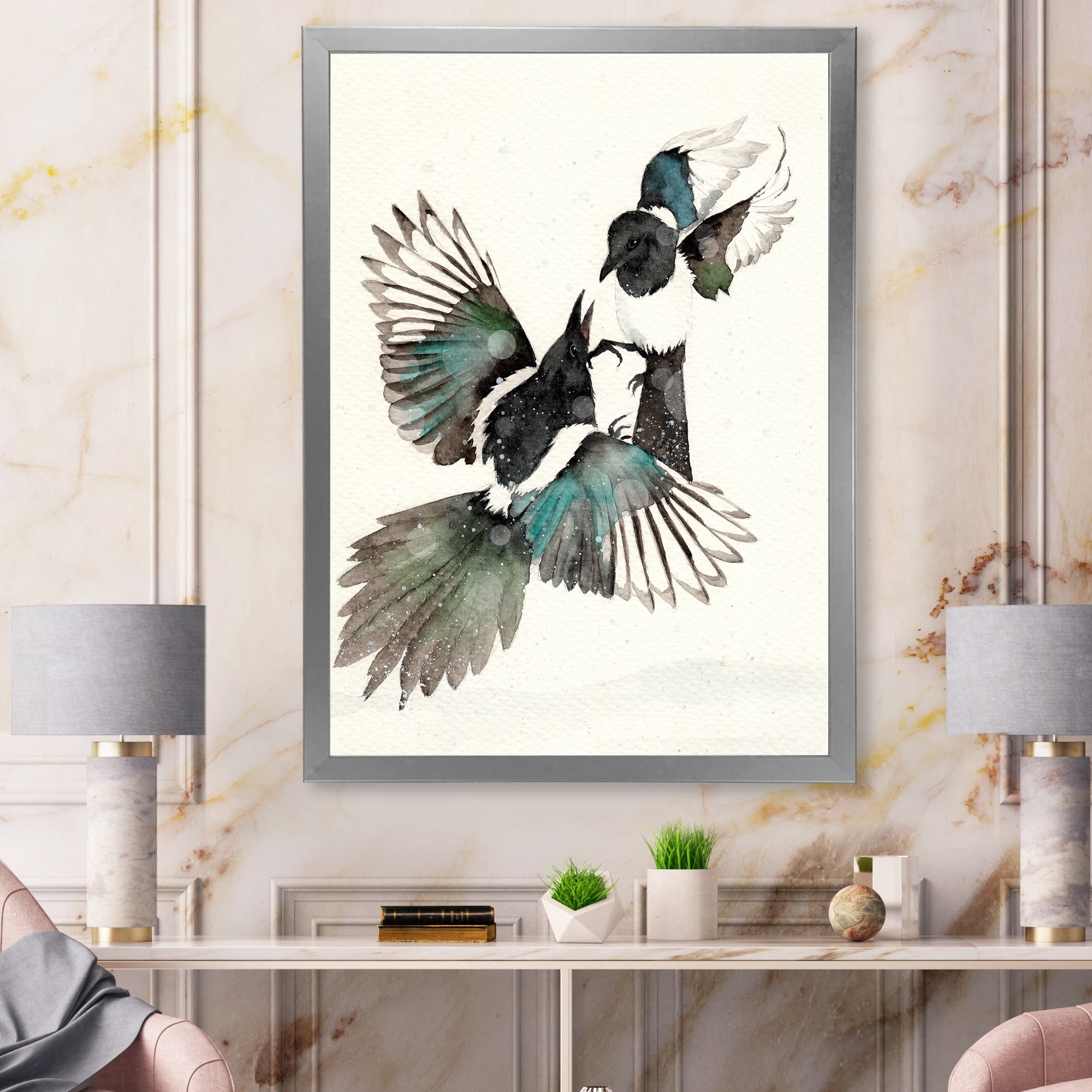 Designart "Two Black And Turquoise Magpies Dancing" Traditional Framed Canvas Wall Art Print
