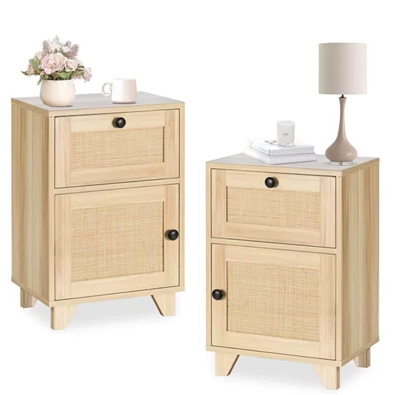 Rattan Nightstand Set of 2, Bedside Table with 2 shlves & 1 Cabinet, End Table for Bedroom, Living Room and Small Places