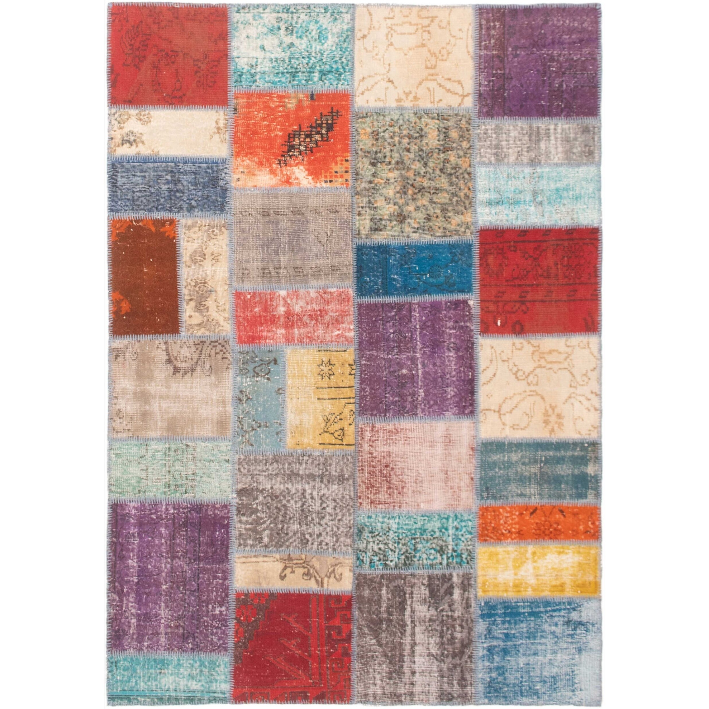 Hand-knotted Color Patchwork Cream, Tan Wool Rug - 5'8" x 8'0"