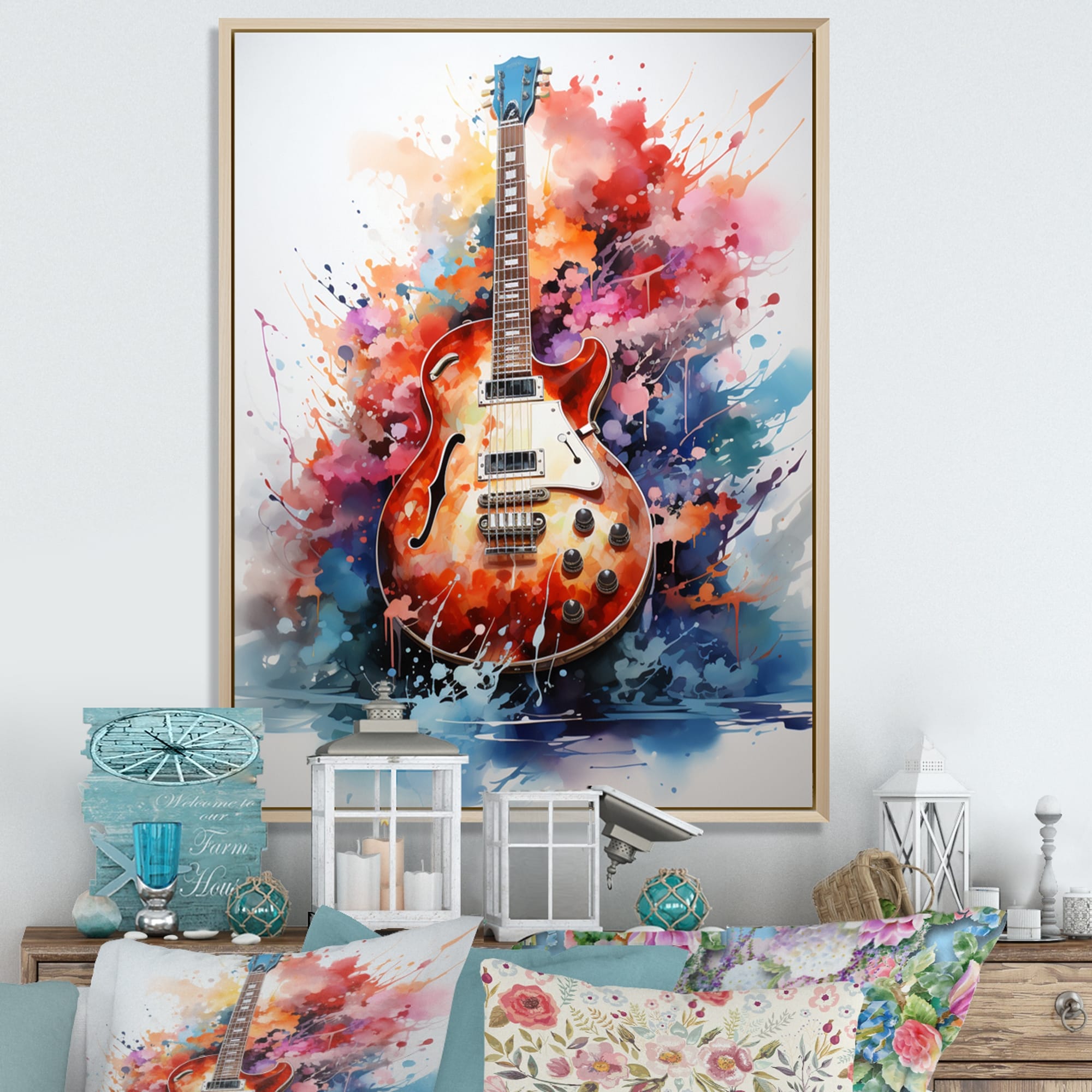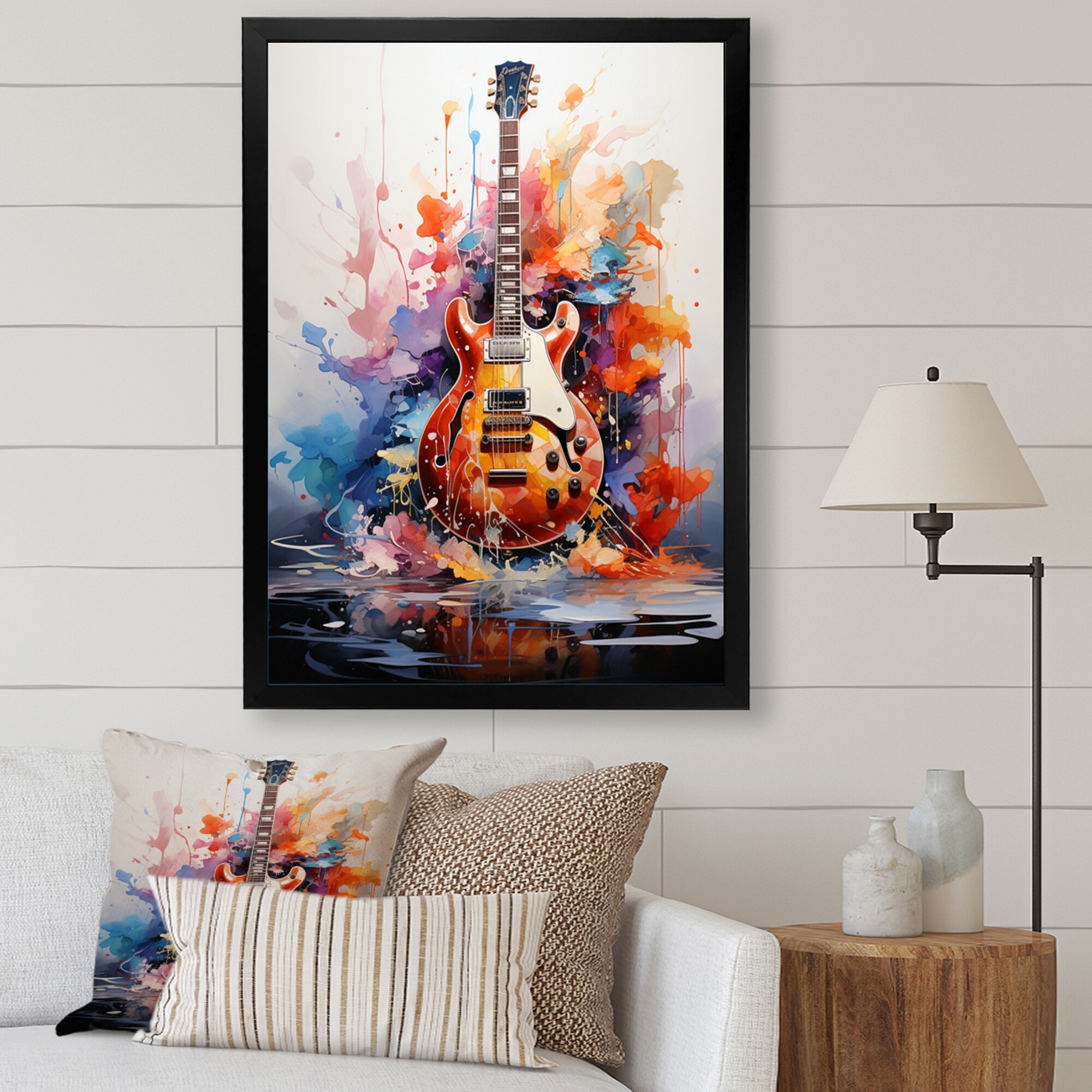 Designart "Dry Watercolor Fire Guitar I" Music Framed Canvas Wall Art