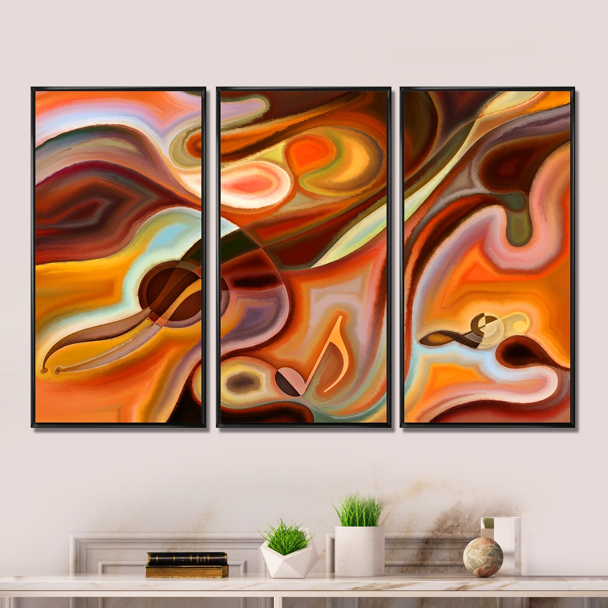 Designart "Music Dreams" Abstract Framed Canvas Wall Art Set of 3 - 4 Colors of Frames