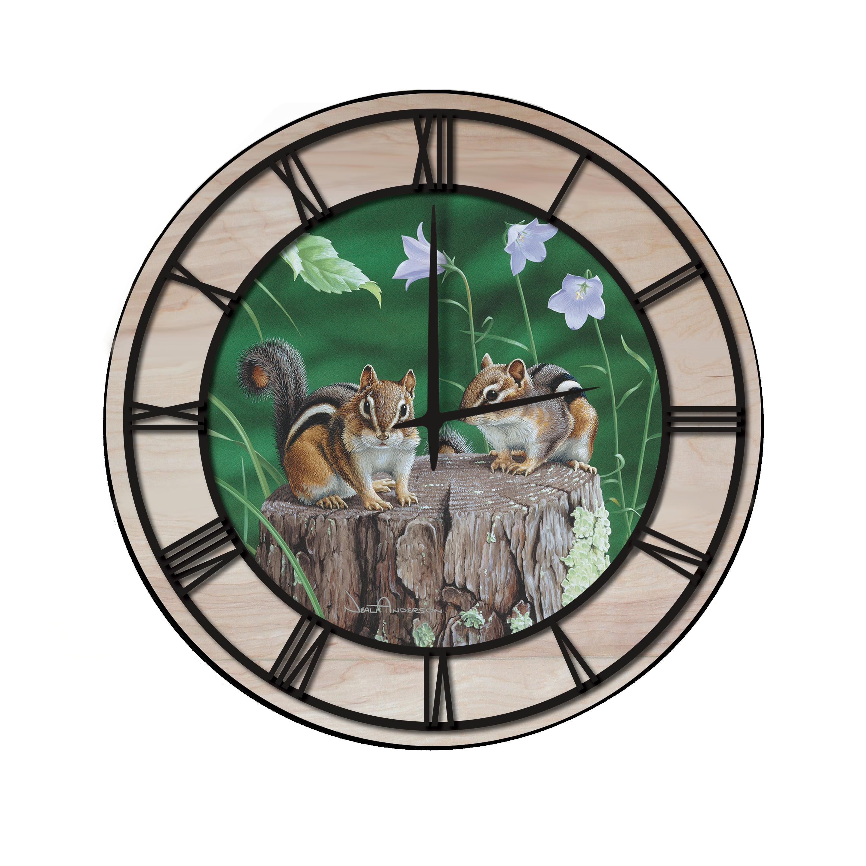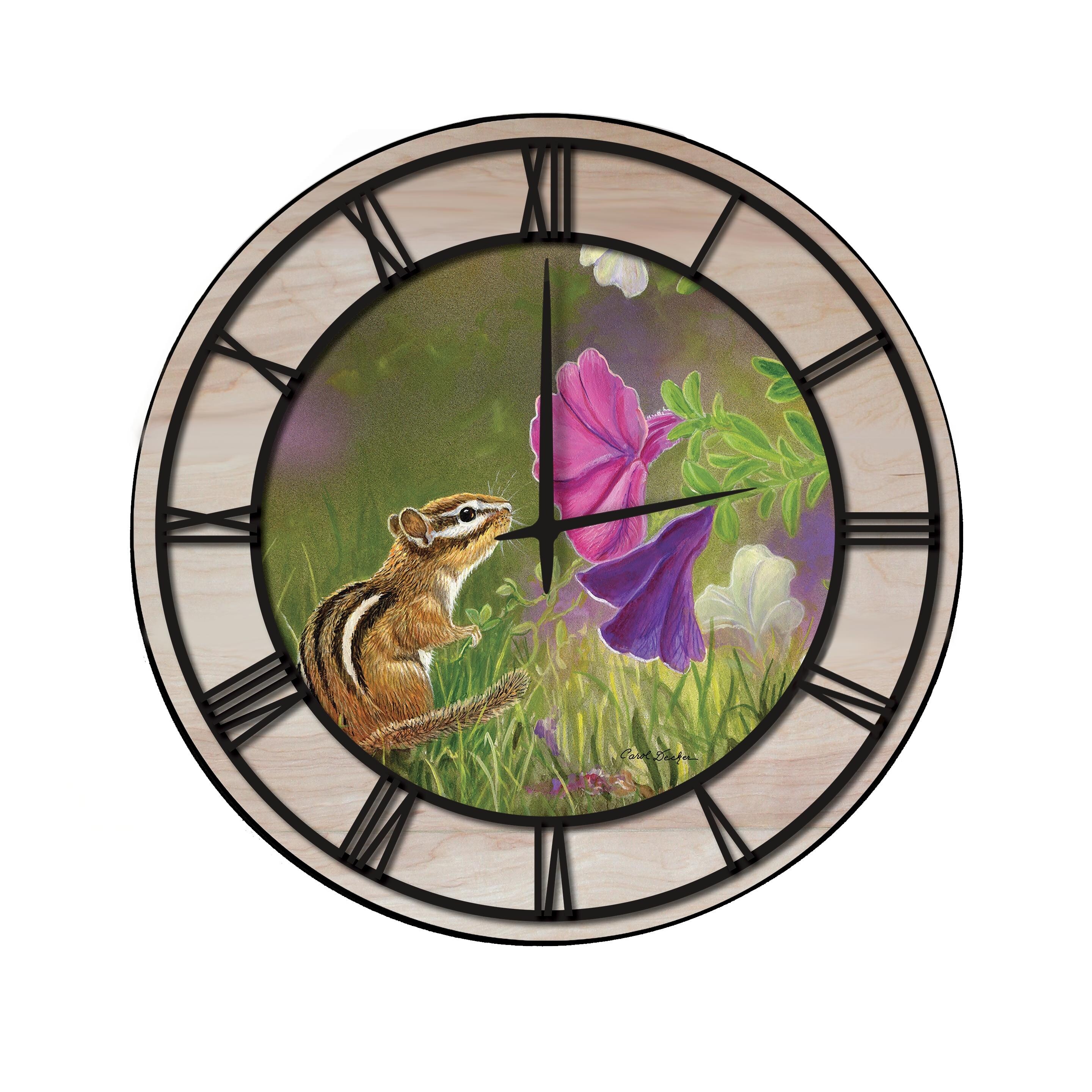 Wall Clock with Natural Woodgrain Accent - Chipmunk in the Garden - Black Numbers - 24" x 24"