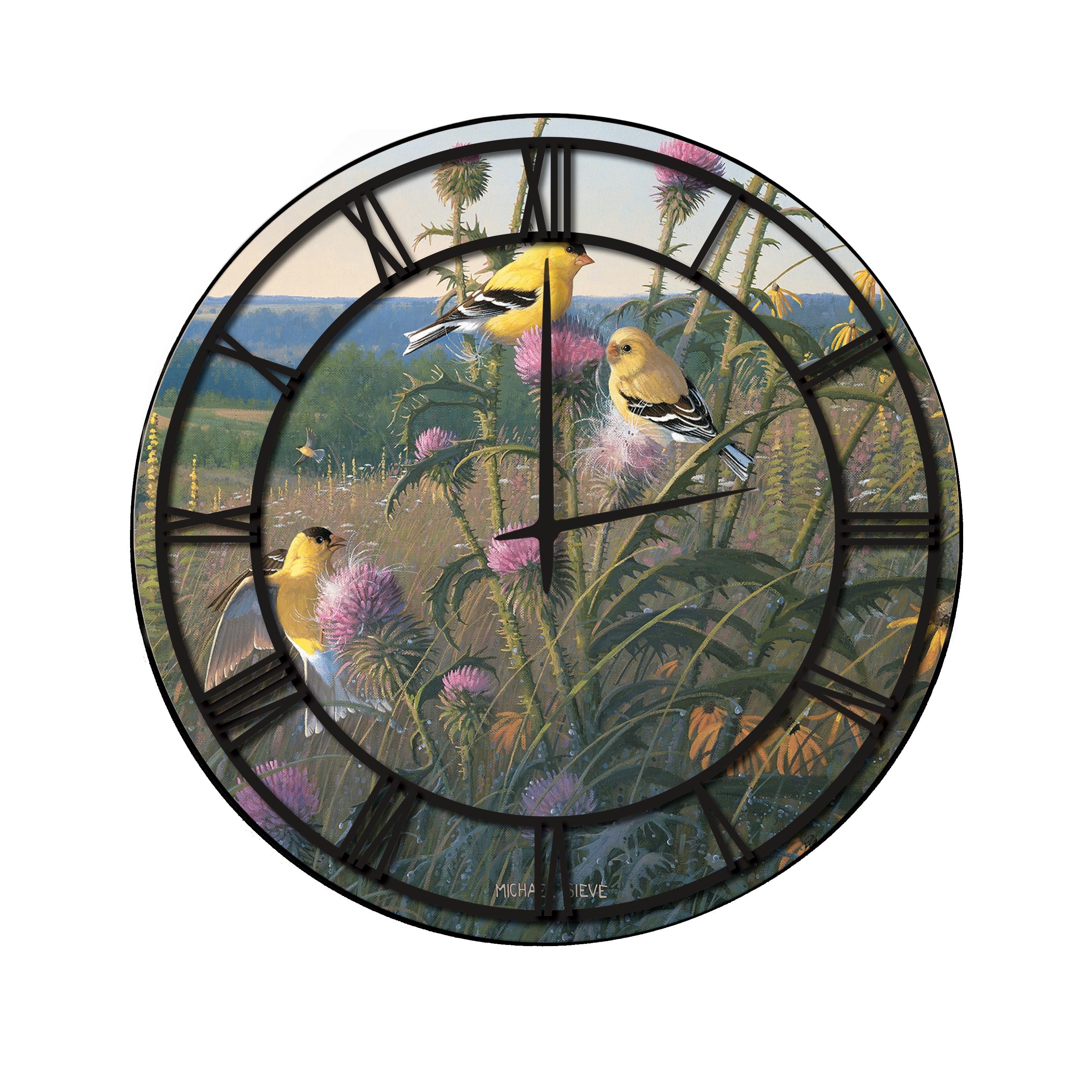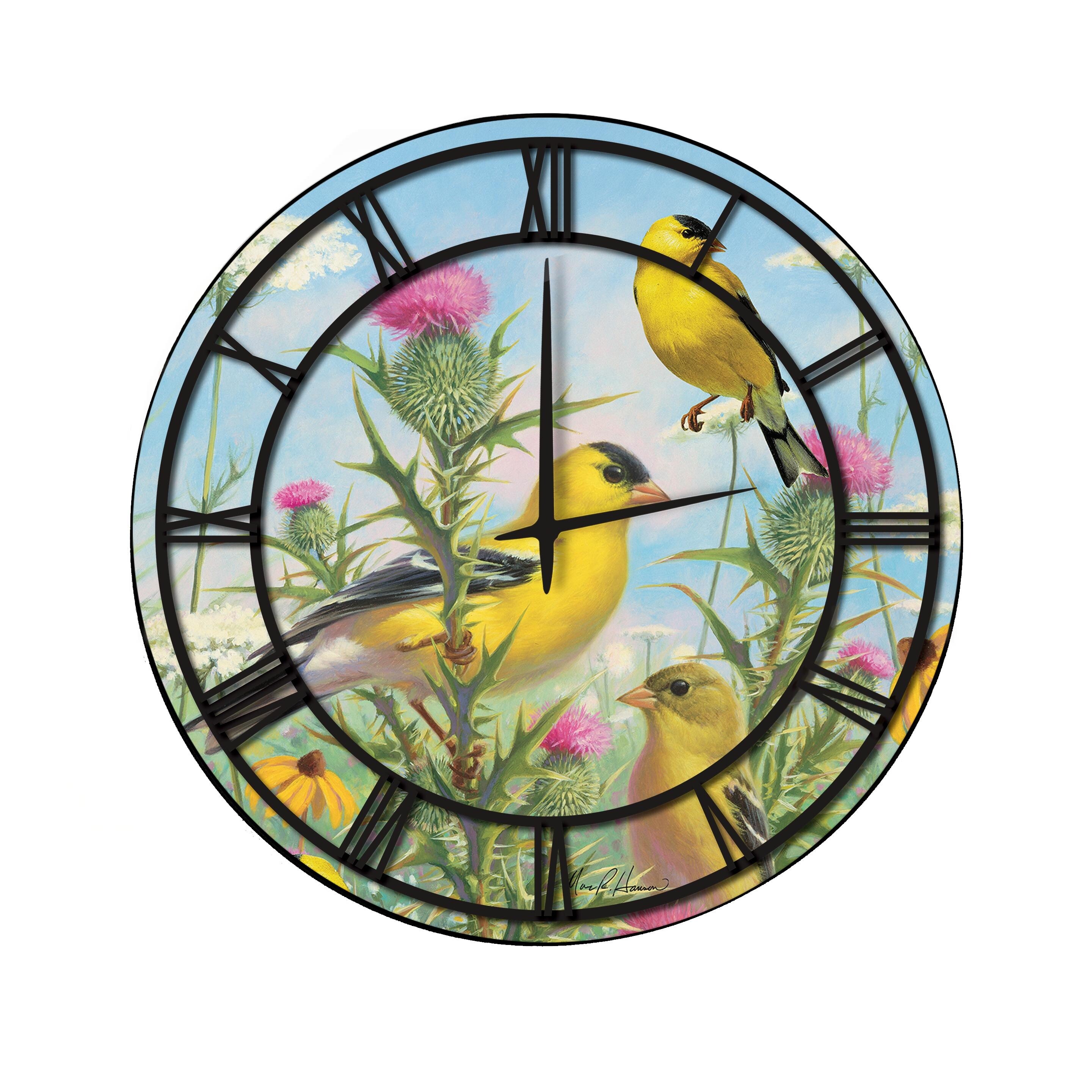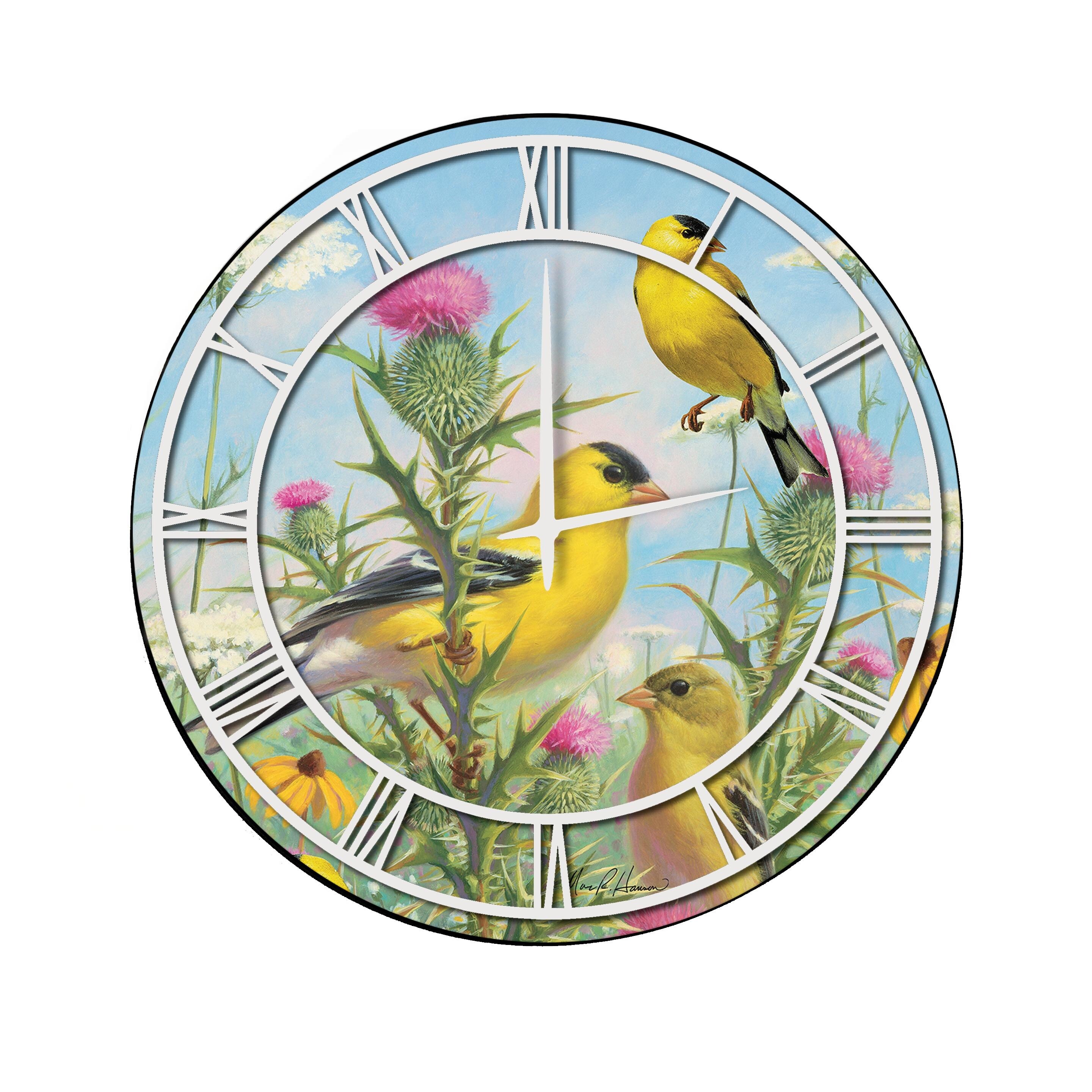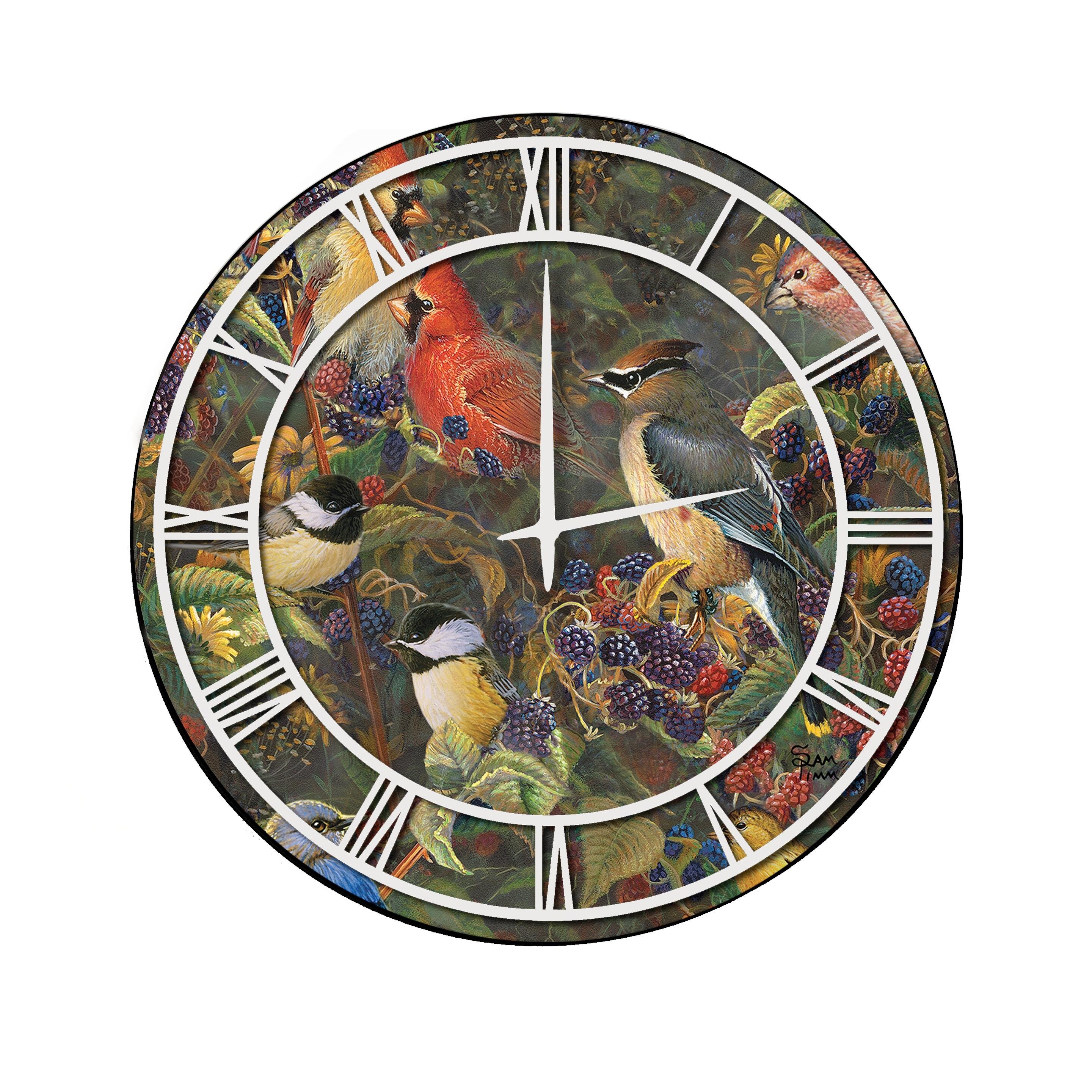 Wall Clock with Full Coverage Art - Berry Bush Songbirds - White Numbers - 24" x 24"