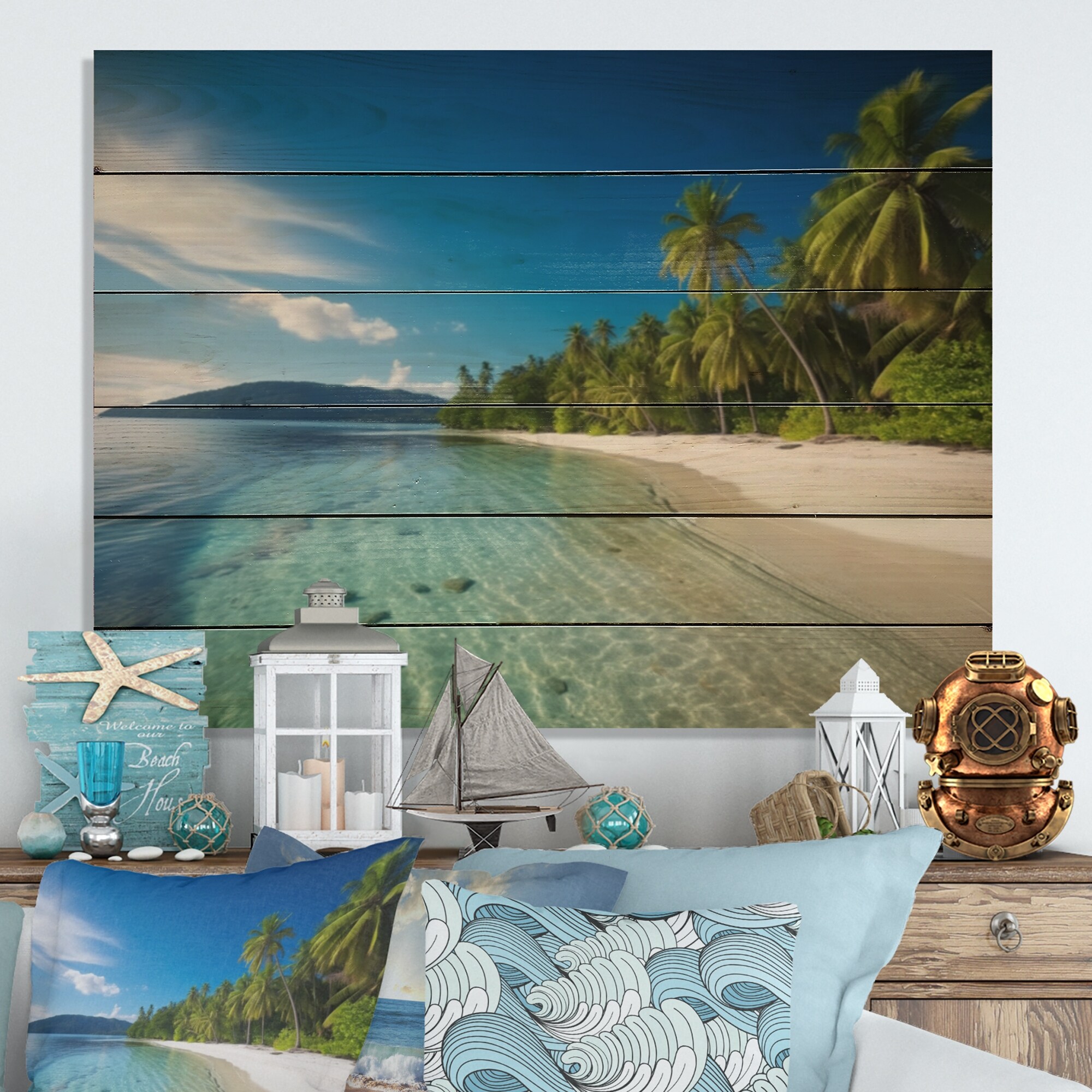 Designart "Ocean Blue Paradise" Modern Landscape Beach Print on Natural Pine Wood