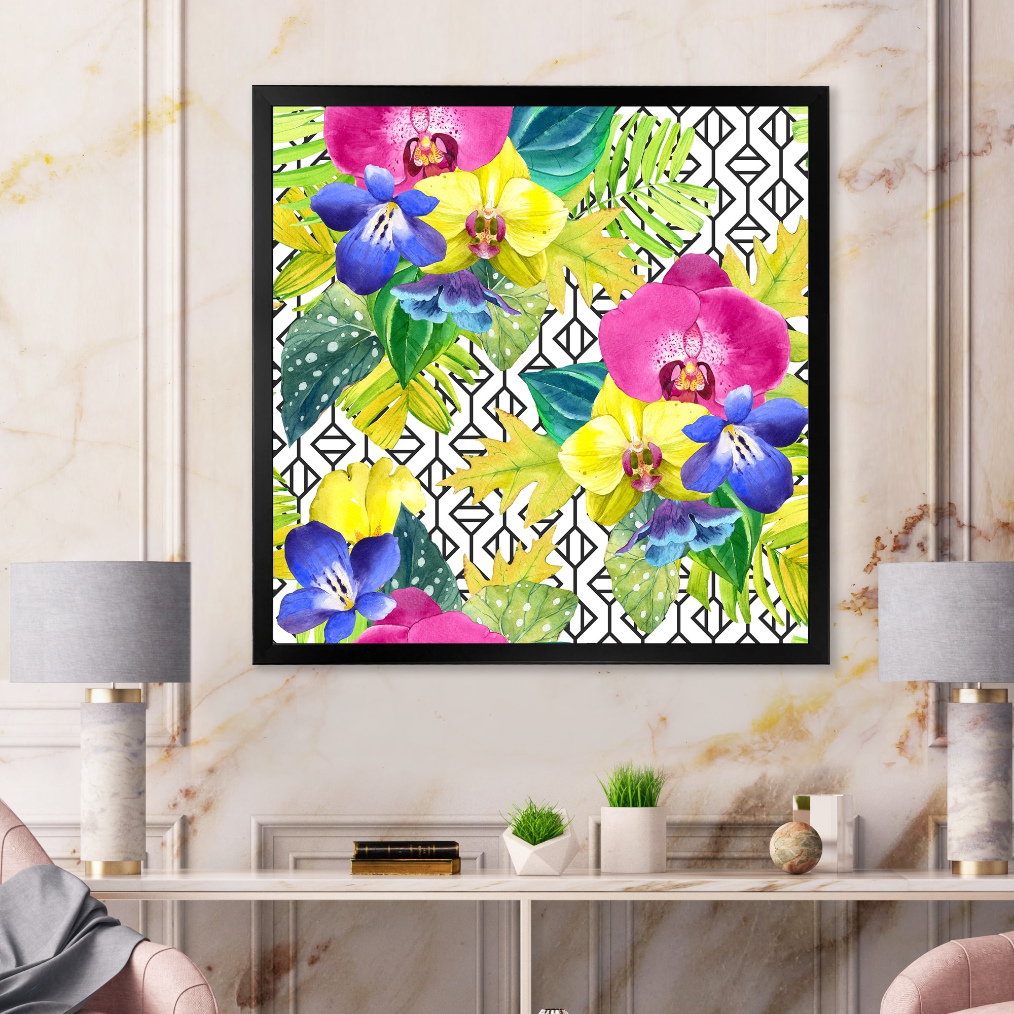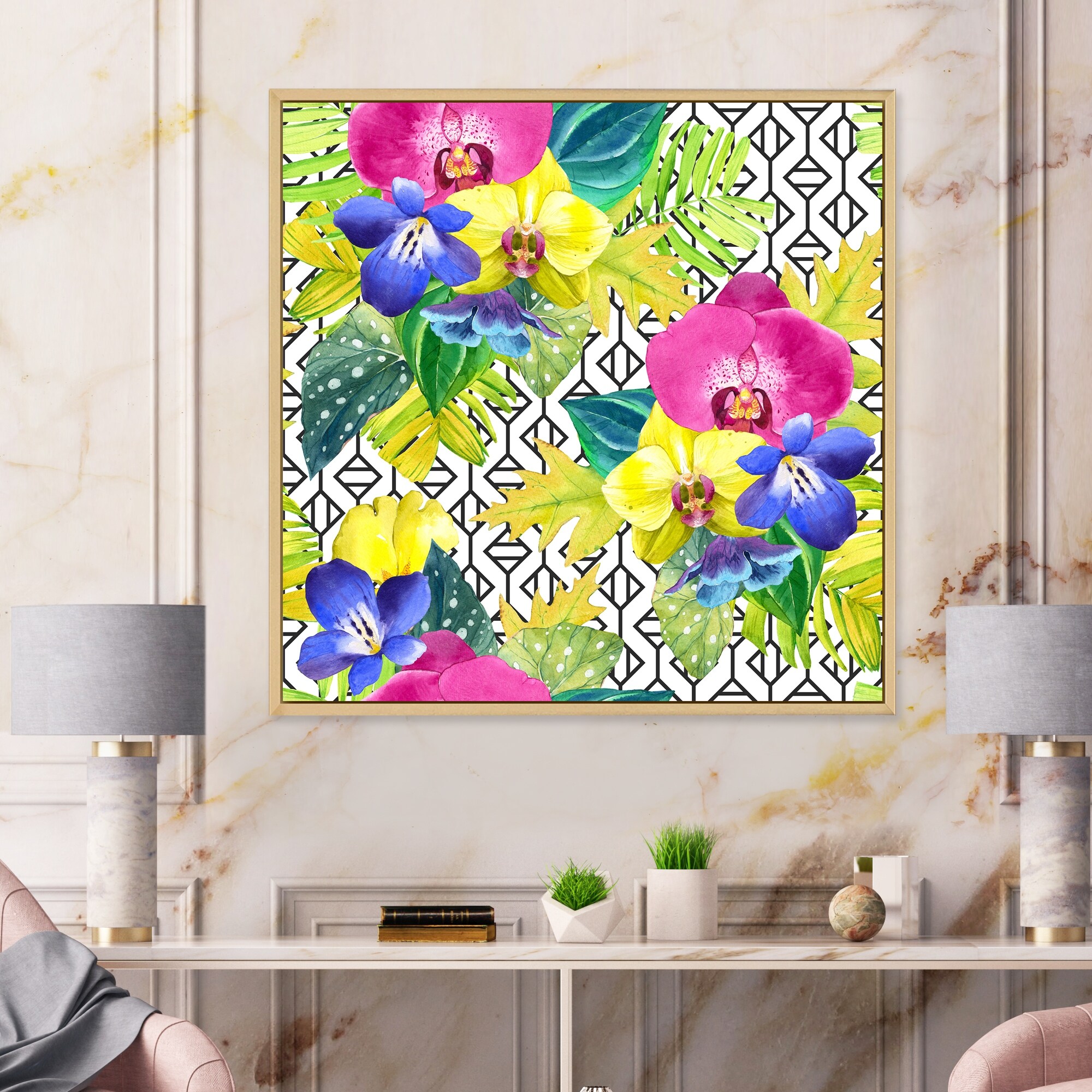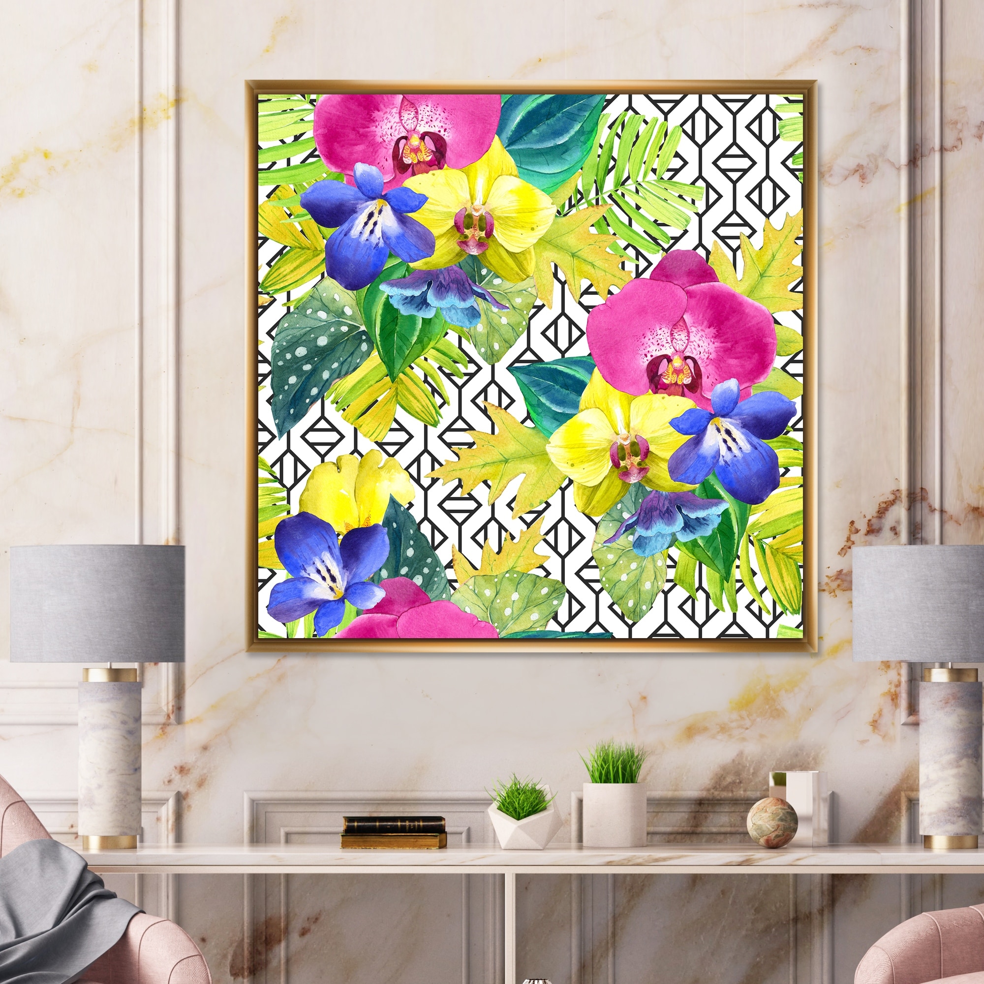 Designart "Yellow Blue And Fuchia Orchids on Organic Grid" Tropical Framed Canvas Wall Art Print