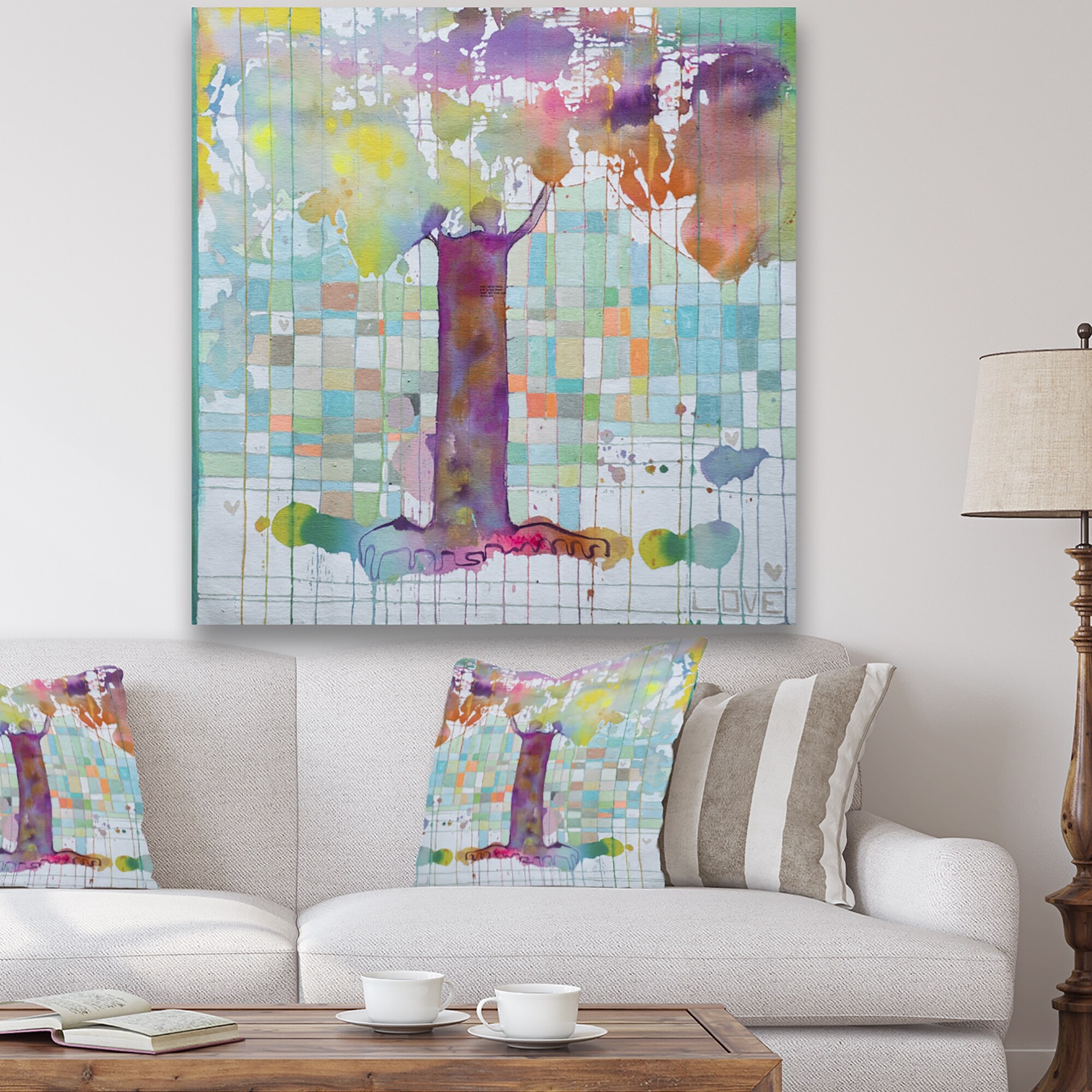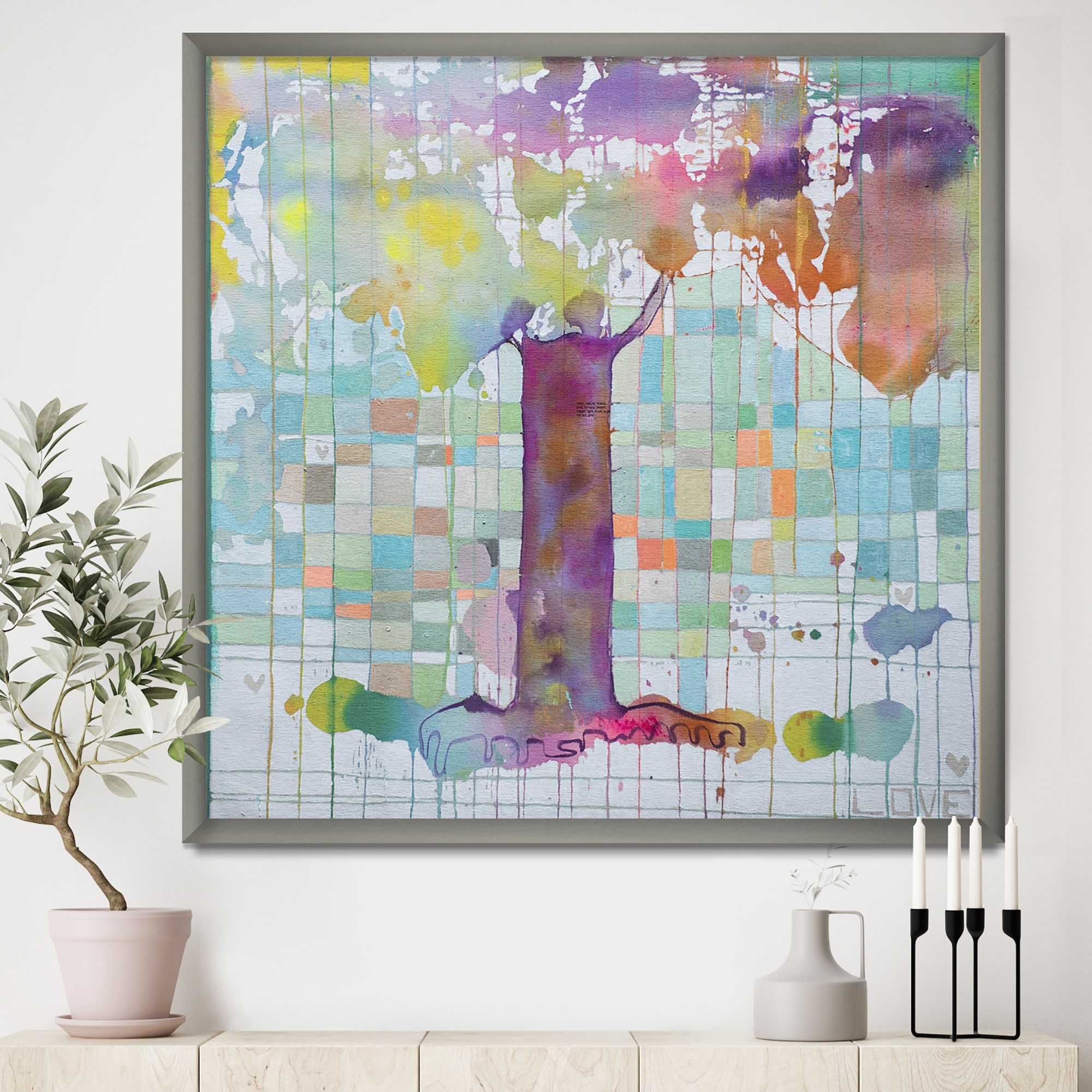 Designart "White Tree on Colorful Grid II" Modern & Contemporary Framed Canvas Wall Art