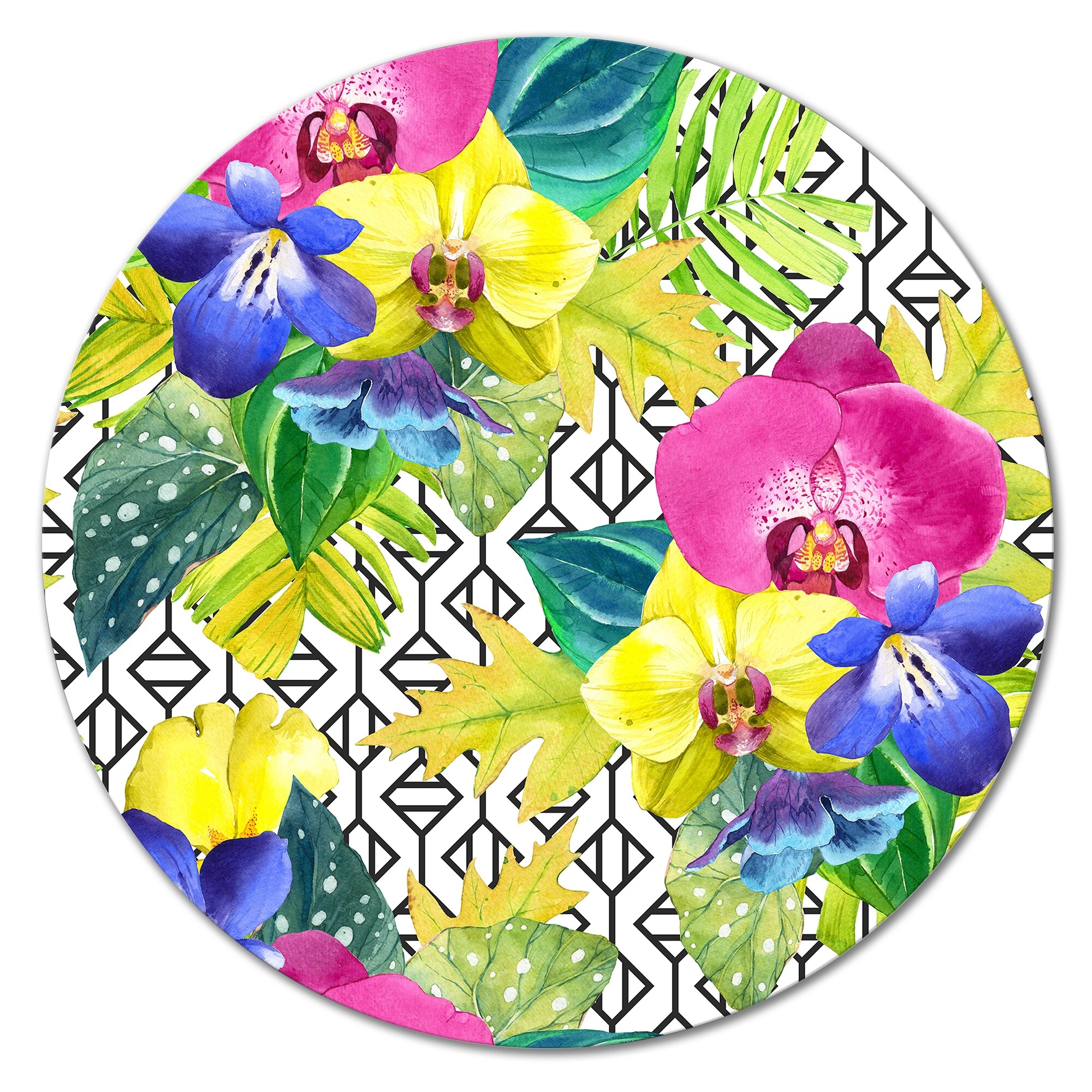 Designart 'Yellow Blue And Fuchia Orchids on Organic Grid' Tropical Metal Circle Wall Art