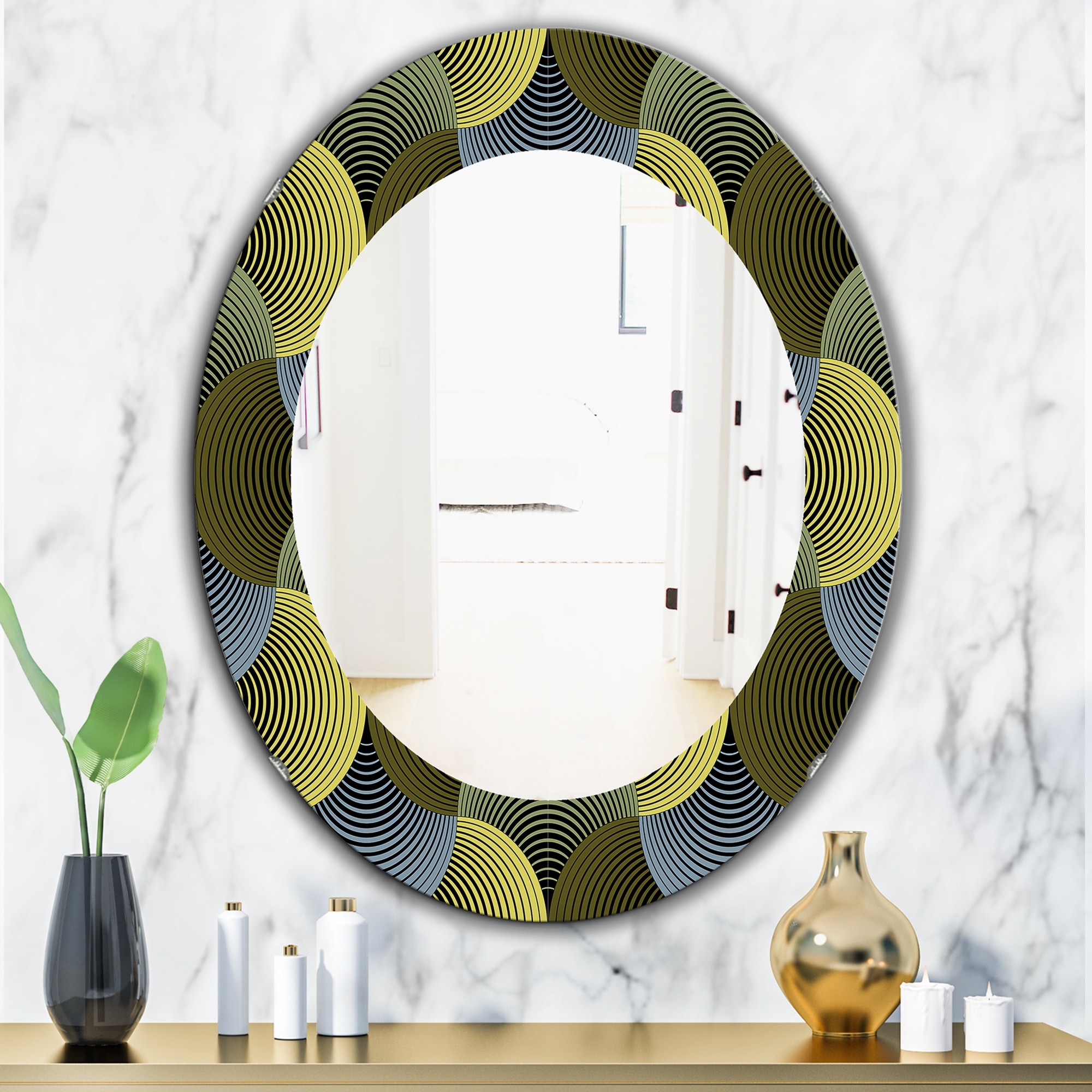 Designart 'Ornate Geometric Petals Grid' Printed Modern Mirror - Oval or Round Wall Mirror - Green