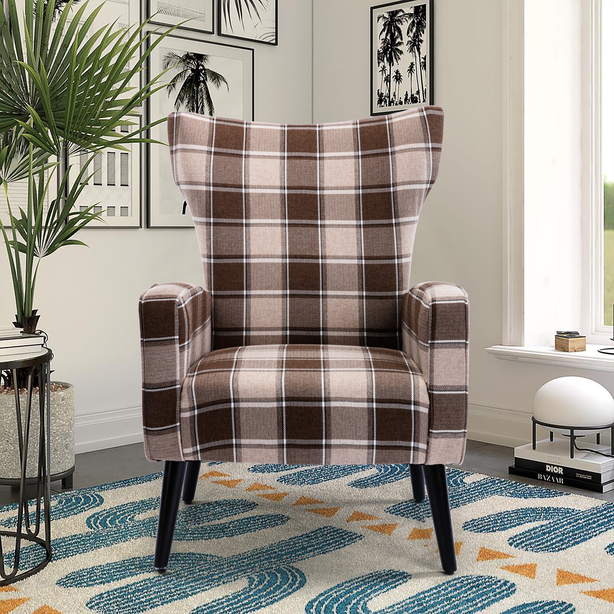 Linen Upholstered Wingback Grid Living Room Chair With Wooden Legs
