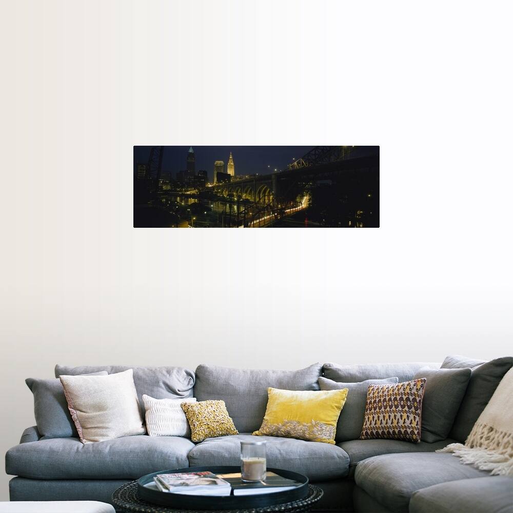 "Arch bridge and buildings lit up at night, Cleveland, Ohio" Poster Print