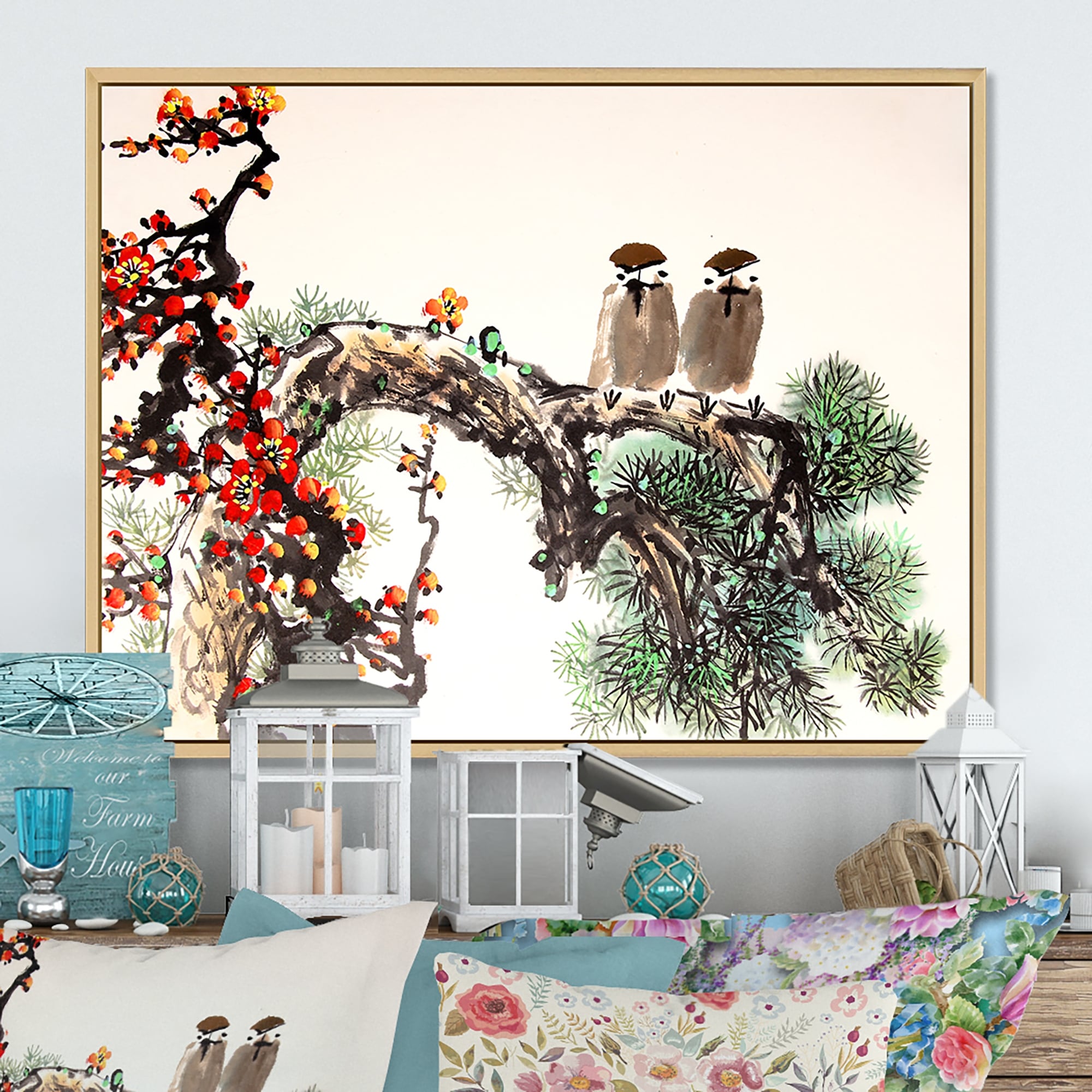 Designart "Chinese Ink Painting Bird And" Traditional Framed Canvas Wall Decor