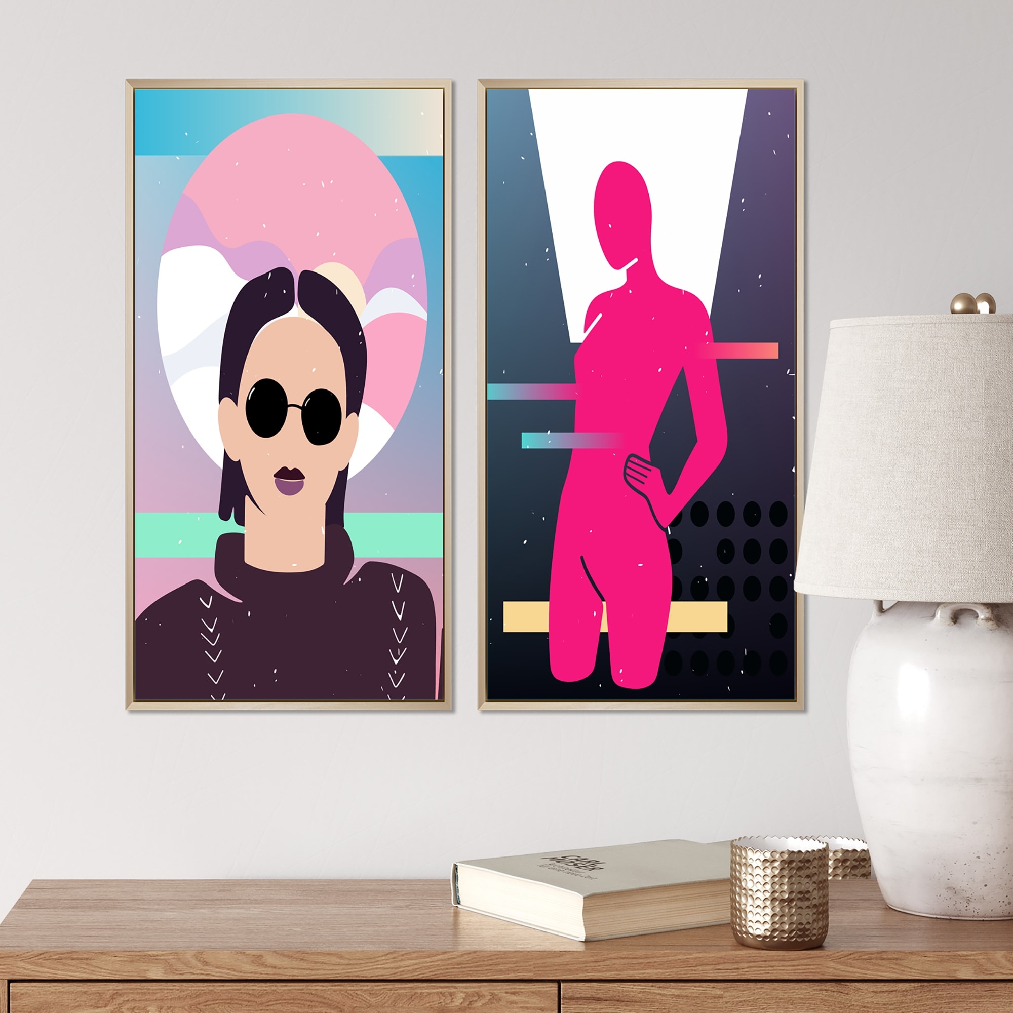 Designart "Pop Art Retro Woman Portrait Minimalistic III" People Framed Art Set of 2 Pieces