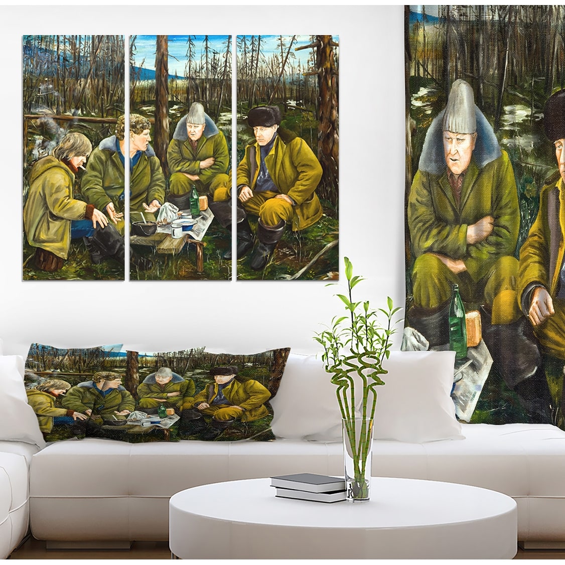 Designart "Four Hunters in Camp" People Print on Wrapped Canvas set - 36x28 - 3 Panels