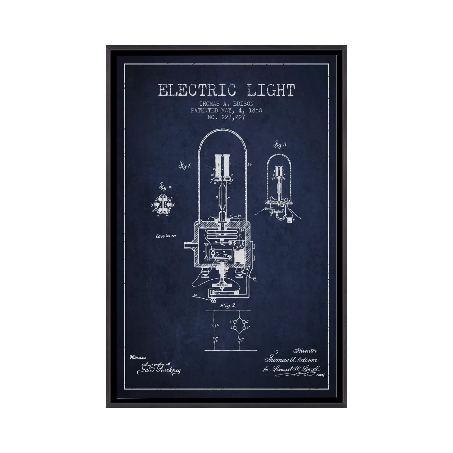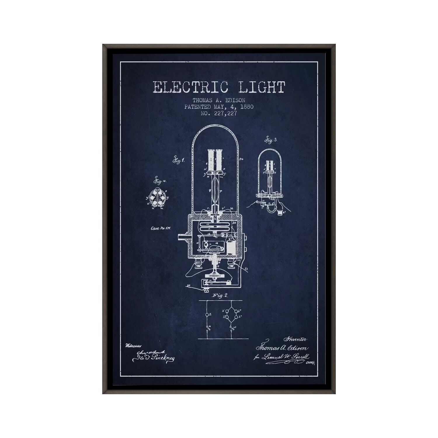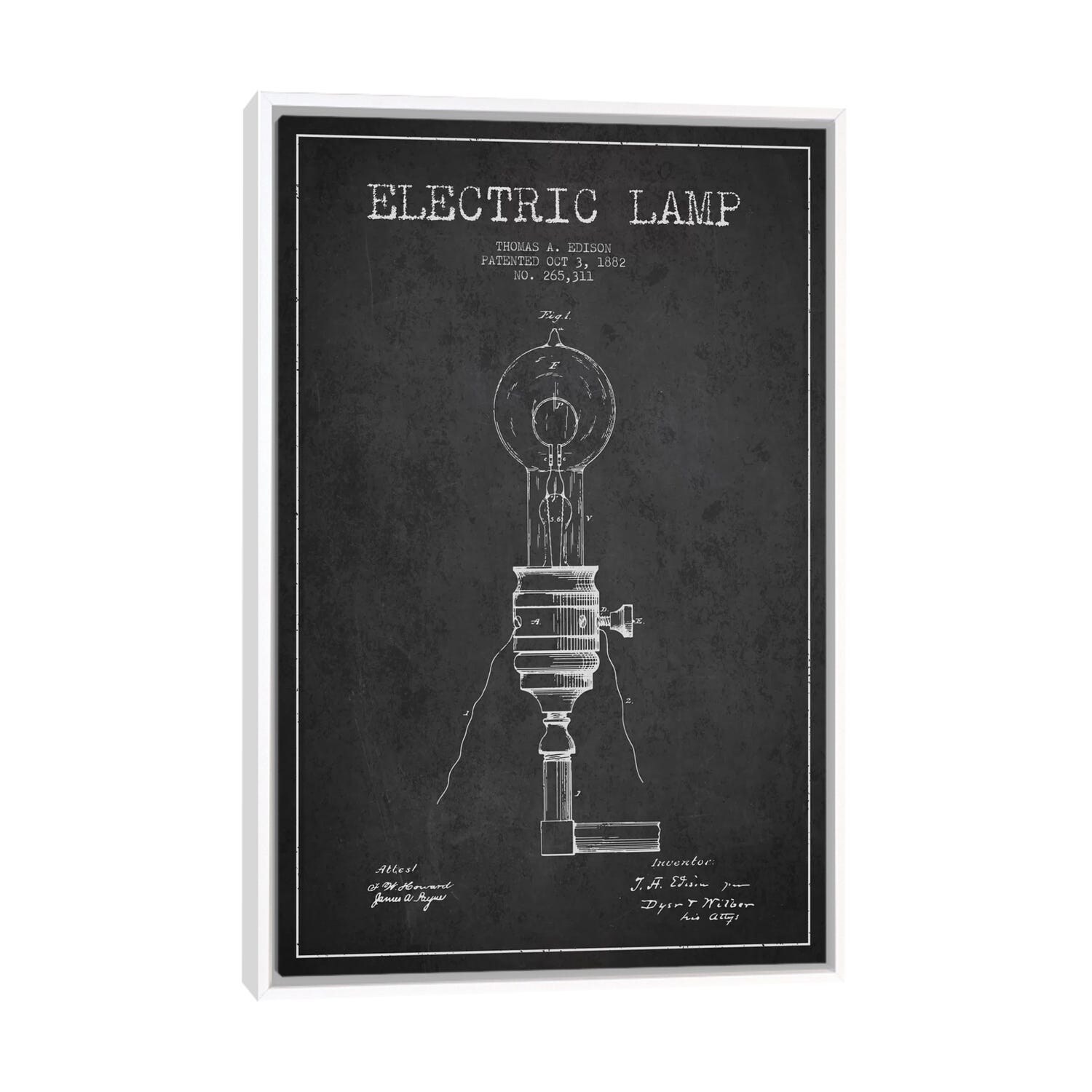iCanvas "Electric Lamp Charcoal Patent Blueprint" by Aged Pixel Framed