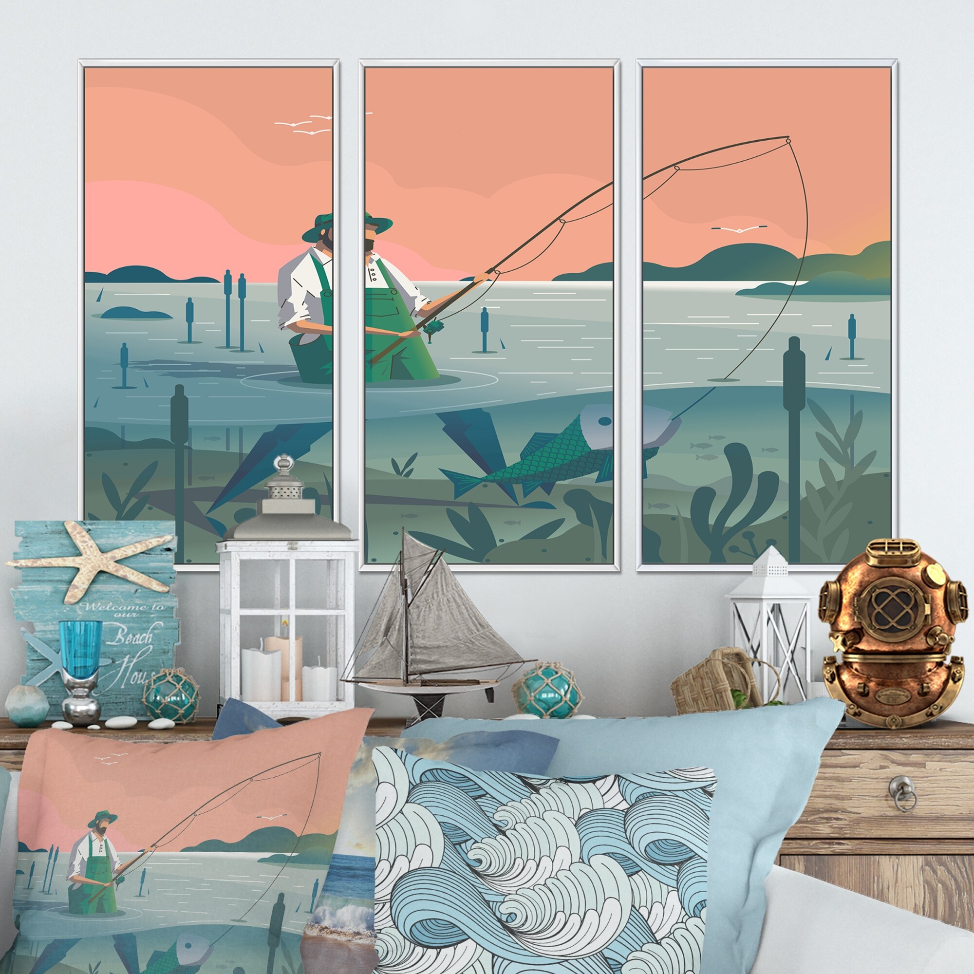 Designart "Man Standing in Pond Fishing" Nautical & Coastal Framed Artwork Set of 3 - 4 Colors of Frames
