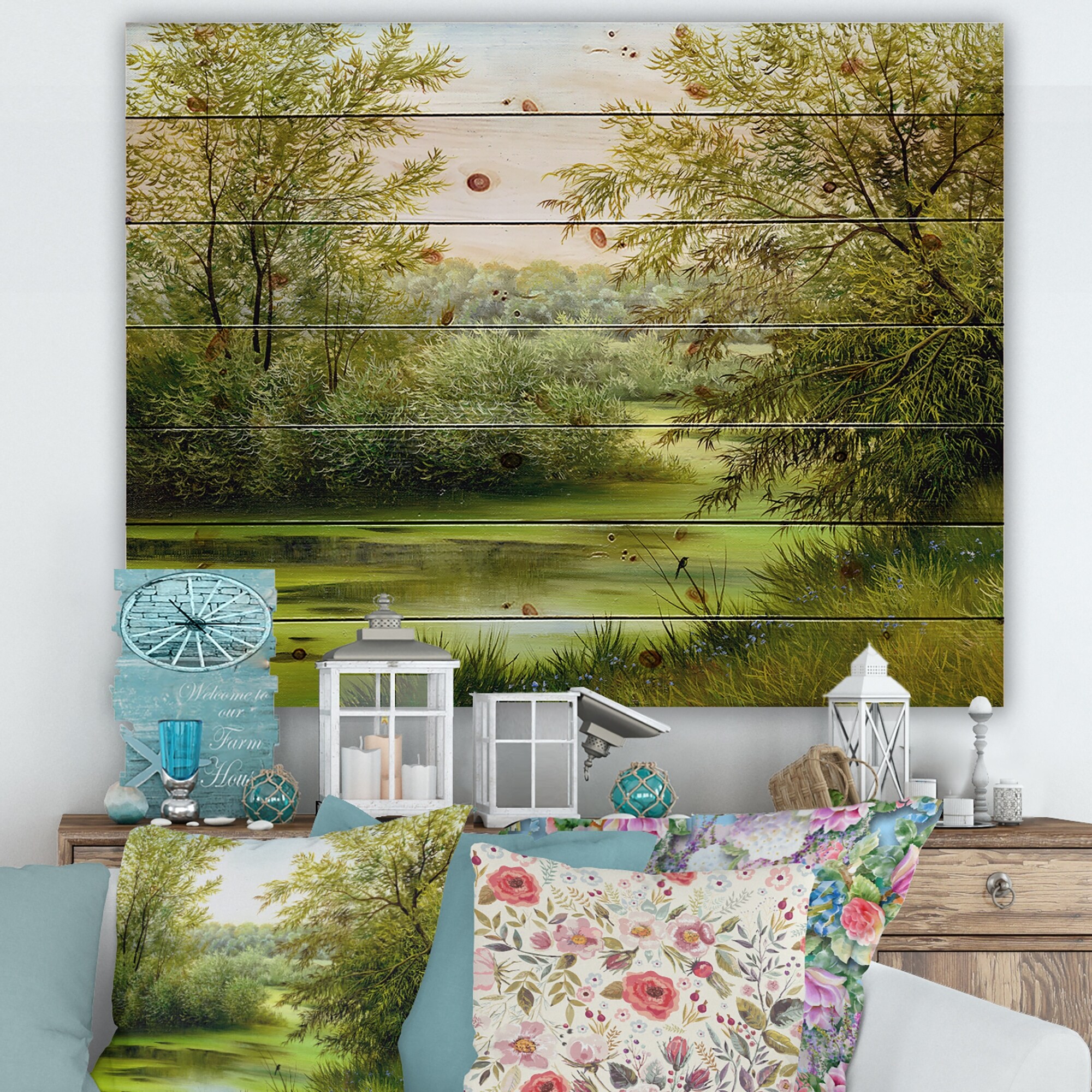 Designart 'Green Pond With Spring Trees' Country Print on Natural Pine Wood