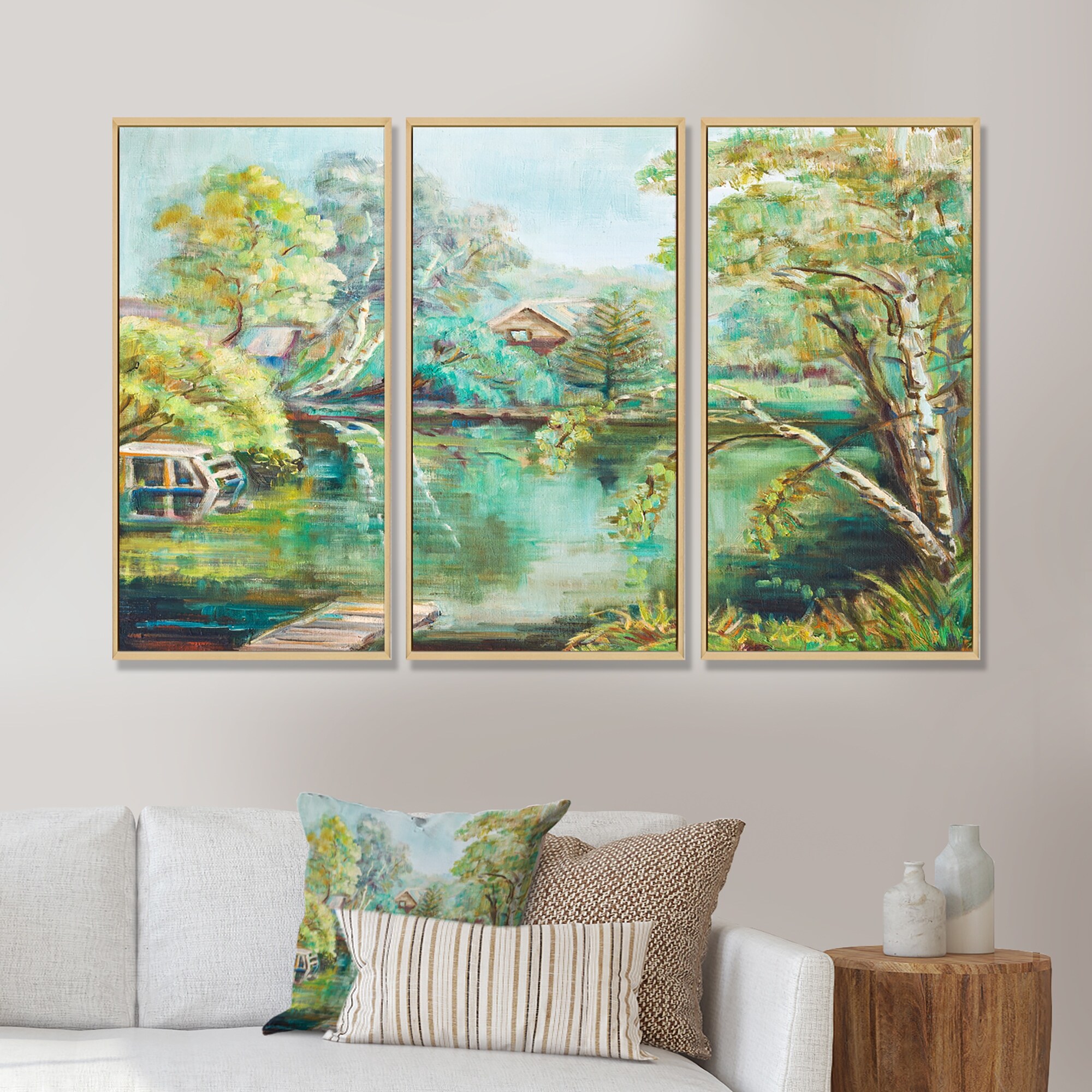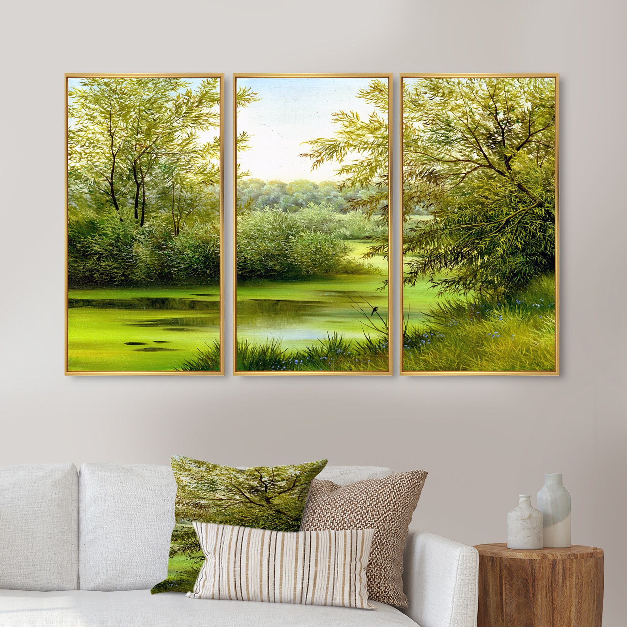 Designart "Green Pond in Summer" Country Framed Wall Art Set of 3 - 4 Colors of Frames