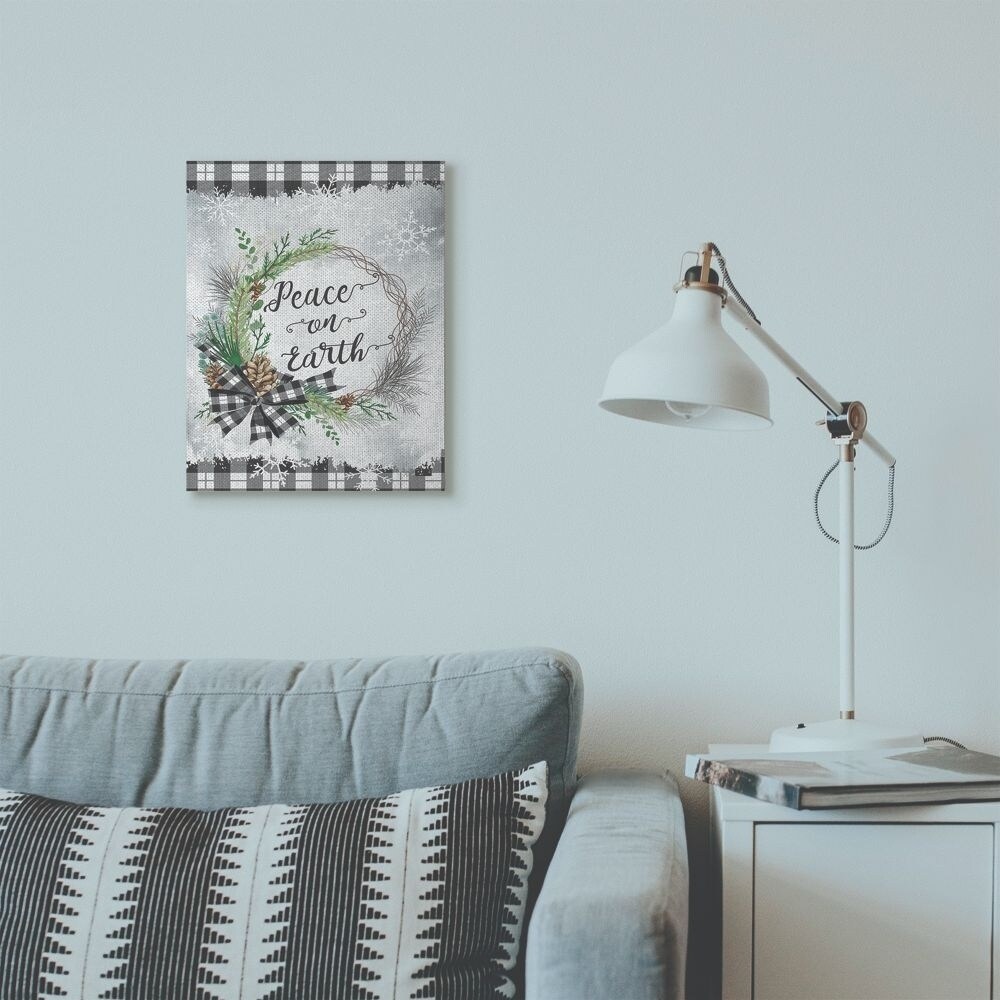 Stupell Industries Peace on Earth Wreath Plaid Holiday Christmas Word Design Canvas Wall Art, Proudly Made in USA