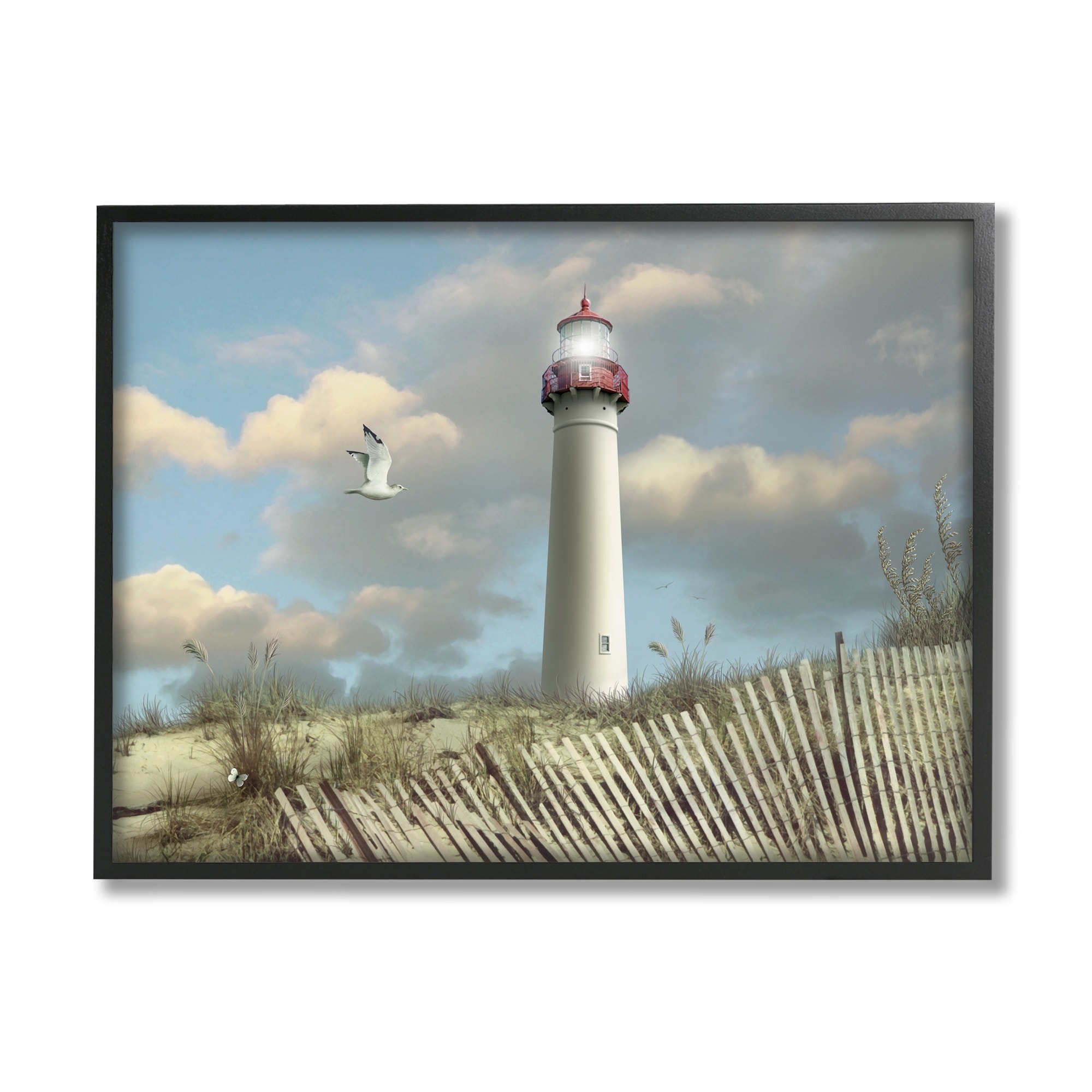 The Stupell Home Decor Cape May Sand Dune Fence Lighthouse Beach Scene with Seagull Framed Art, 11x14, Proudly Made in USA
