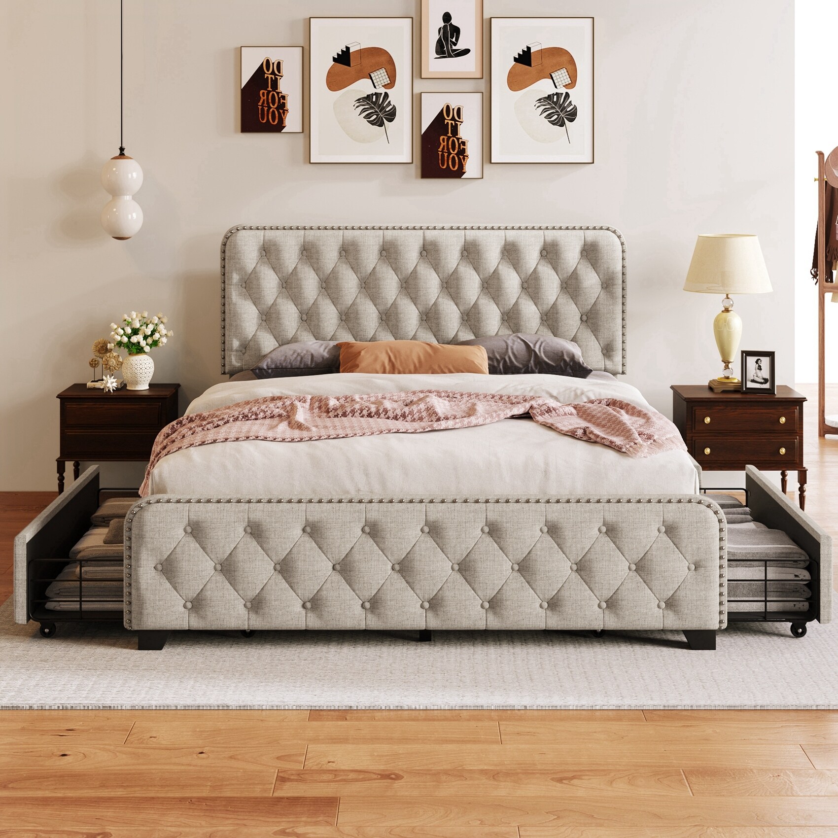 Upholstered Queen Size Metal Support Bed Frame with Drawers