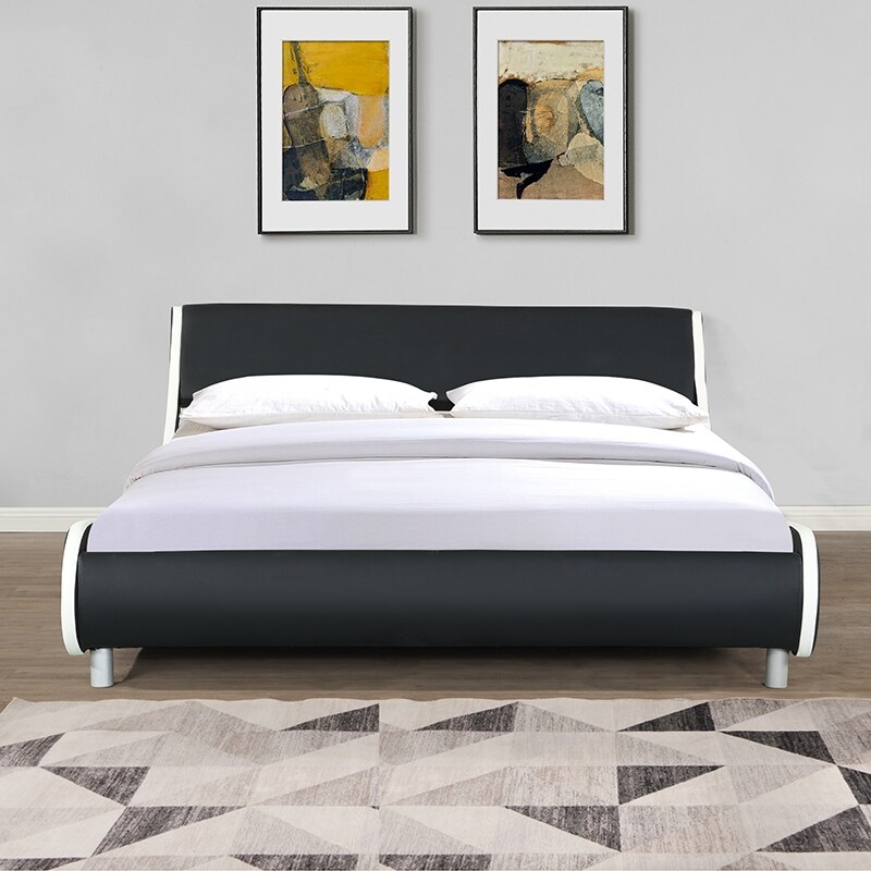 Faux Leather Upholstered Platform Bed Frame with Curve Design Headboard, Queen Size, Black&White