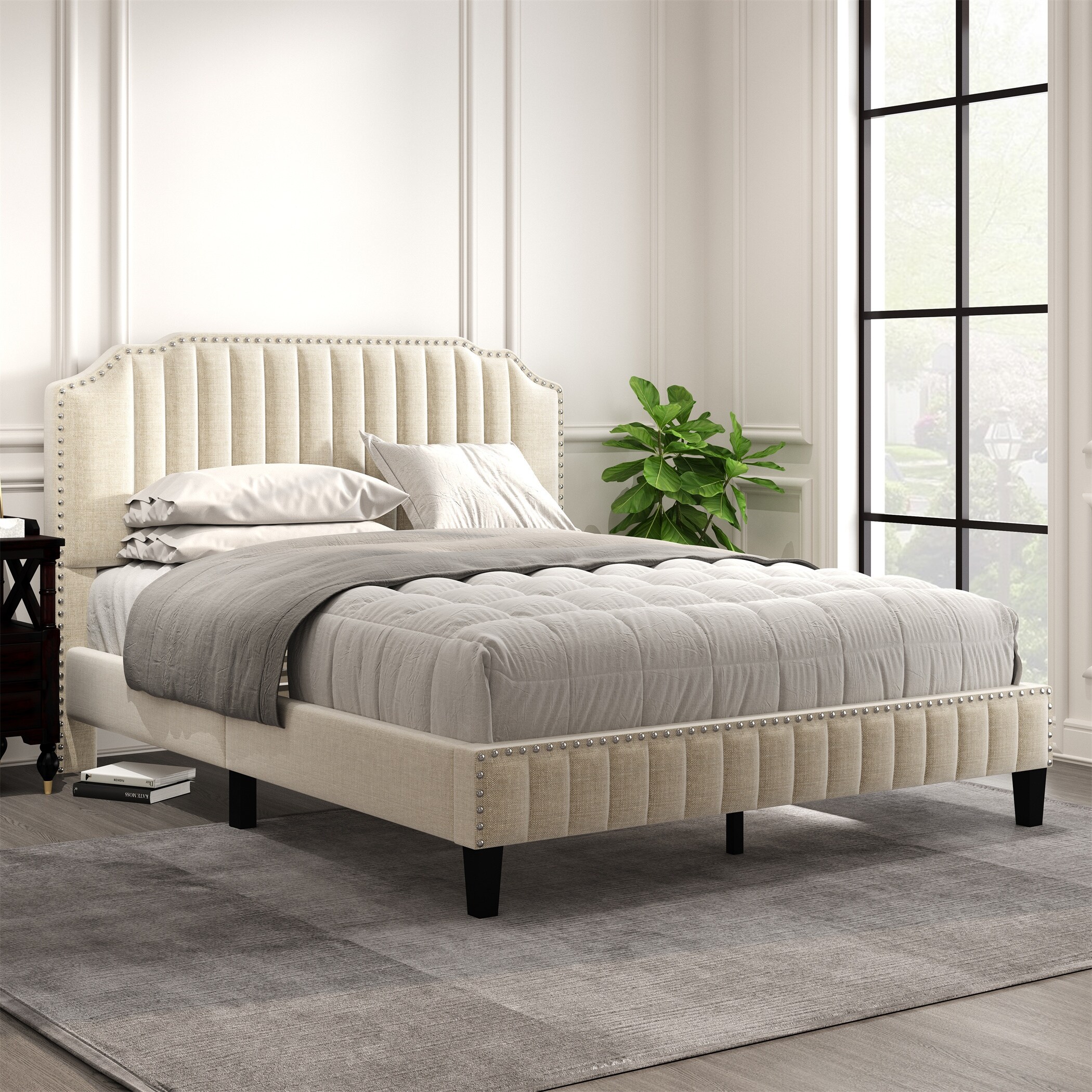 Linen Upholstered Platform Bed with Classic Headboard, Sturdy Wood Frame, Queen Size