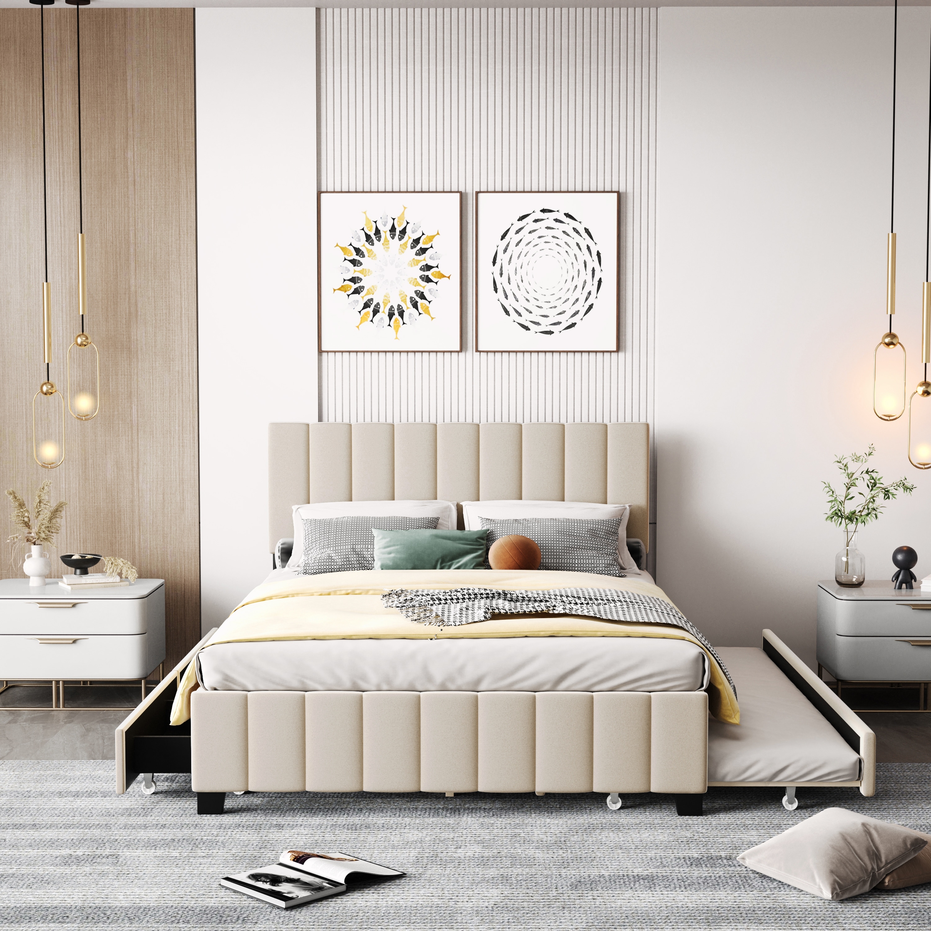 Queen Size Upholstered Platform Bed with Drawers and Twin XL Trundle